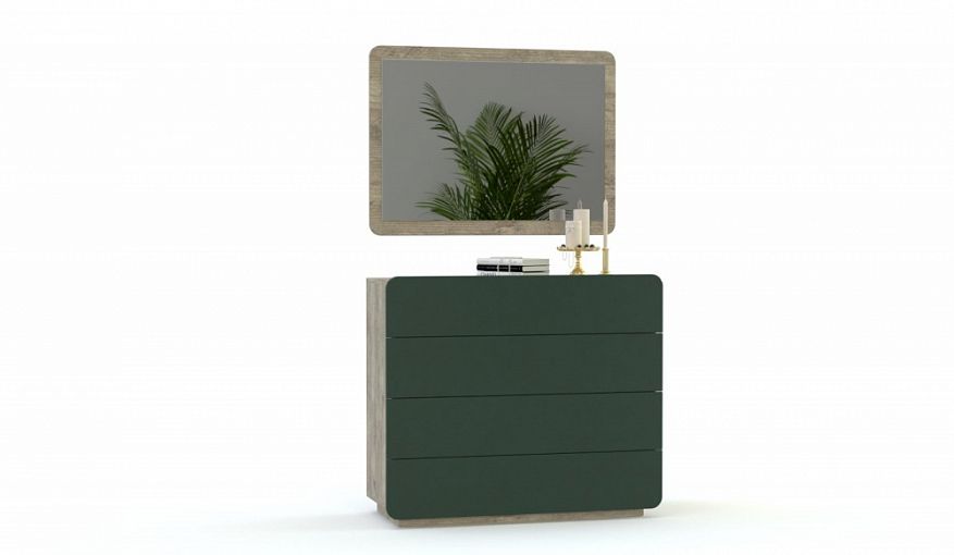 Комод Модерн Люкс 7 BMS по достоинству оценят поклонники минимализма и трендовых дизайнов. Модель на высоком цоколе выполнена в эффектном сочетании натуральных оттенков с имитацией древесной текстуры и насыщенного зеленого цвета. Оборудованный четырьмя вместительными выдвижными ящиками без лицевой фурнитуры, комод дополнен навесным зеркалом в скругленной раме, повторяющей форму фасада. Купить комод Модерн Люкс 7 BMS для стильного спального интерьера, гостиной или прихожей вы сможете в нашем интернет-магазине.