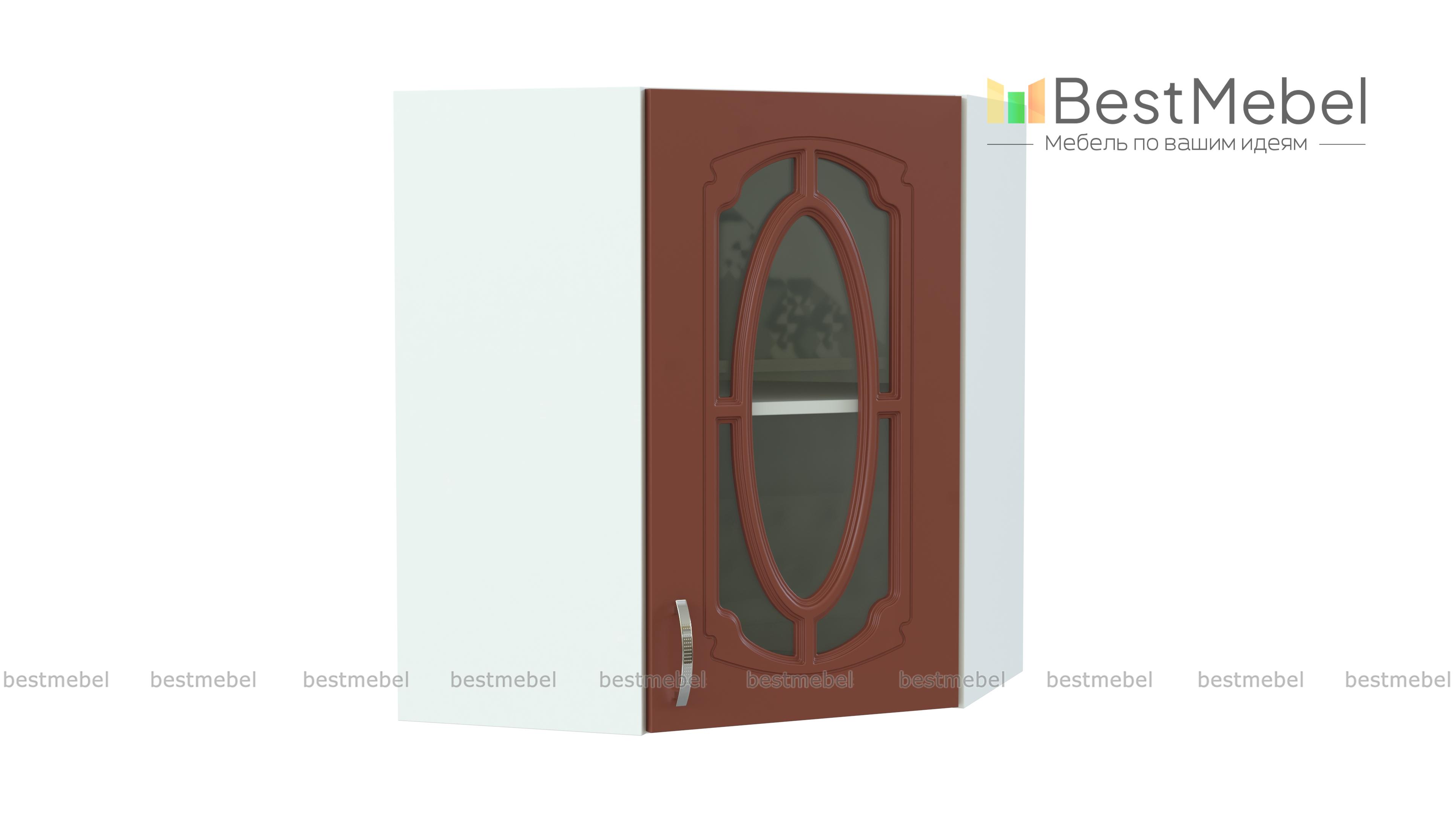 Шкаф верхний угловой остекленный Настя BMS – многофункциональная модель, которая совмещает функции стыковочного элемента и витрины. Шкаф позволяет присоединять модули любой конструкции и отличается вместительностью при компактных размерах. Внутреннее отделение с полкой позволит выгодно разместить посуду, предметы декора, хрупкие вещи, а эффектный декор фасада станет украшением домашнего интерьера. Купить шкаф верхний угловой остекленный Настя BMS вы сможете по лучшей цене в нашем интернет-магазине.