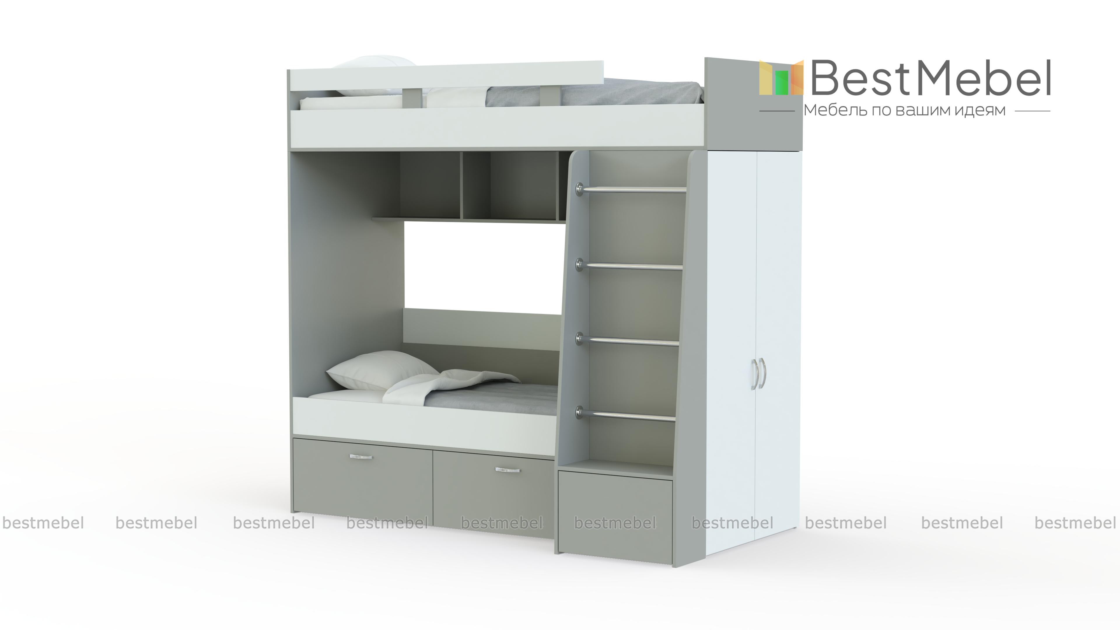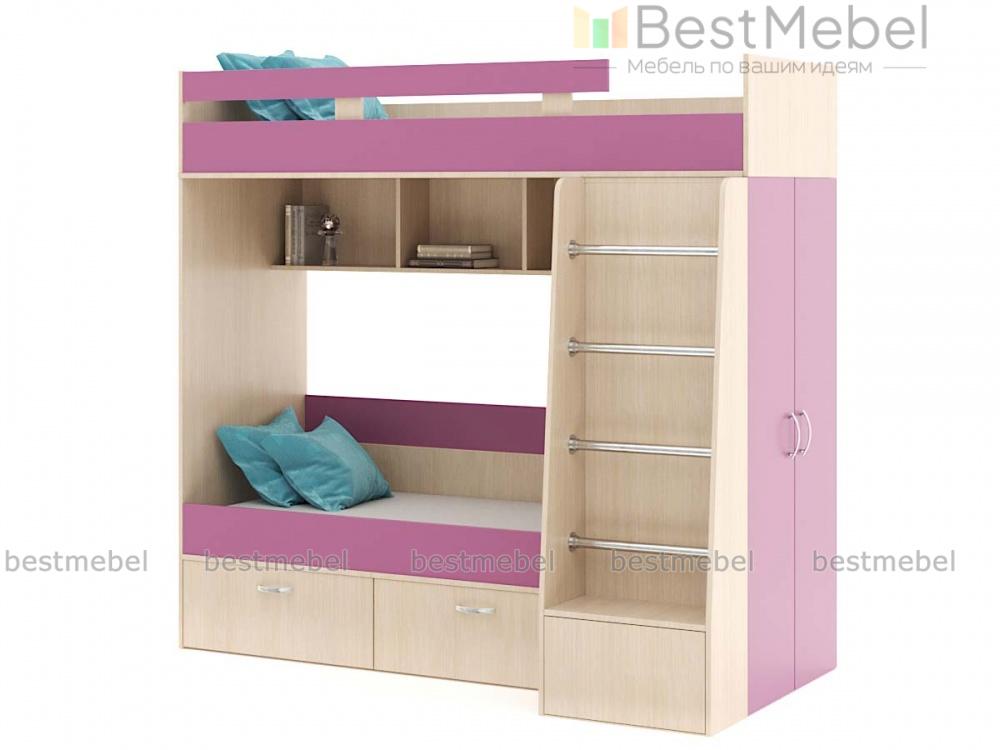 Двухъярусная кровать Белла 6 со шкафом BMS – недорогой современный комплект, который подарит малышам полноценный здоровый сон. Спальное место второго яруса ограждено защитным бортиком, вниз ведет удобная устойчивая лестница. Для хранения предметов гардероба предусмотрен встроенный шкаф, а игрушки и книги смогут расположиться на открытых полках между ярусами и за спинкой кровати. Купить двухъярусную кровать Белла 6 со шкафом BMS в подходящей расцветке вы сможете в нашем интернет-магазине.