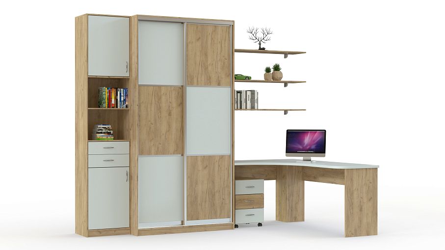 Шкаф-купе с угловым столом 18Б BMS поможет оборудовать комфортную комнату для современного подростка. Продуманная композиция включает в себя двухдверный шкаф-купе для одежды, комбинированный шкаф с нишами и угловой компьютерный стол со столешницей эргономичной формы и тумбой. Геометричный дизайн модели подчеркивает сочетание белого и бежевого цвета. Экологичные износостойкие материалы станут залогом долгого срока службы и эстетичного вида. Купить шкаф-купе с угловым столом 18Б BMS вы сможете в нашем интернет-магазине с учетом необходимых параметров.