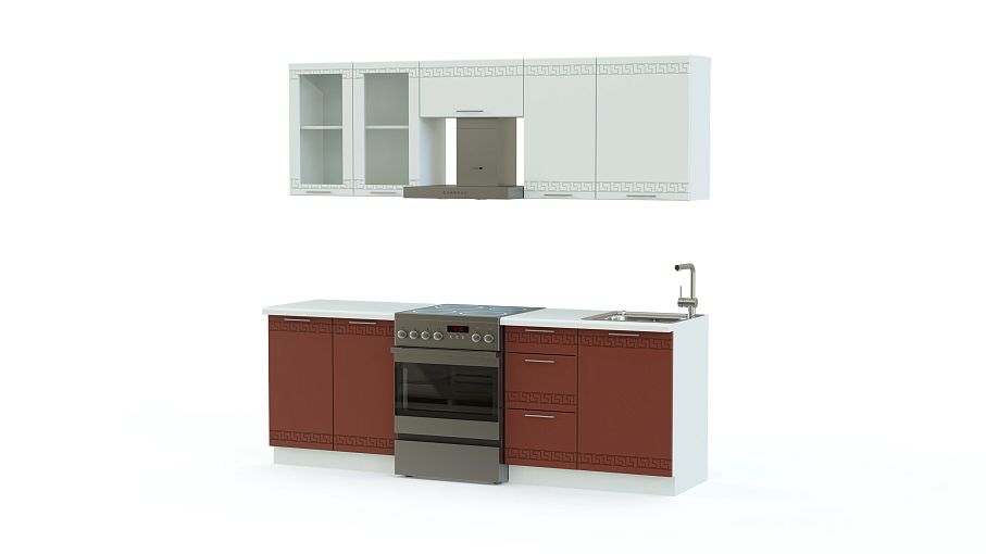 Небольшая, стильная и симпатичная модель, которая одинаково хорошо смотрится в большом помещении и маленьком. Кухня Греция 01 BMS удобная и функциональная, выполнена в модных контрастных цветах с оригинальной шероховатой фактурой материала. Гарнитур имеет небольшие тумбочки (под мойку и с выдвижными ящичками) и большую – с полками и рабочей поверхностью. Много места предоставляют три навесных шкафчика: оригинальный шкаф под вытяжку, с застекленными и с распашными дверками и художественным принтом. Вы можете купить кухню Греция 01 BMS другого цвета и размера.