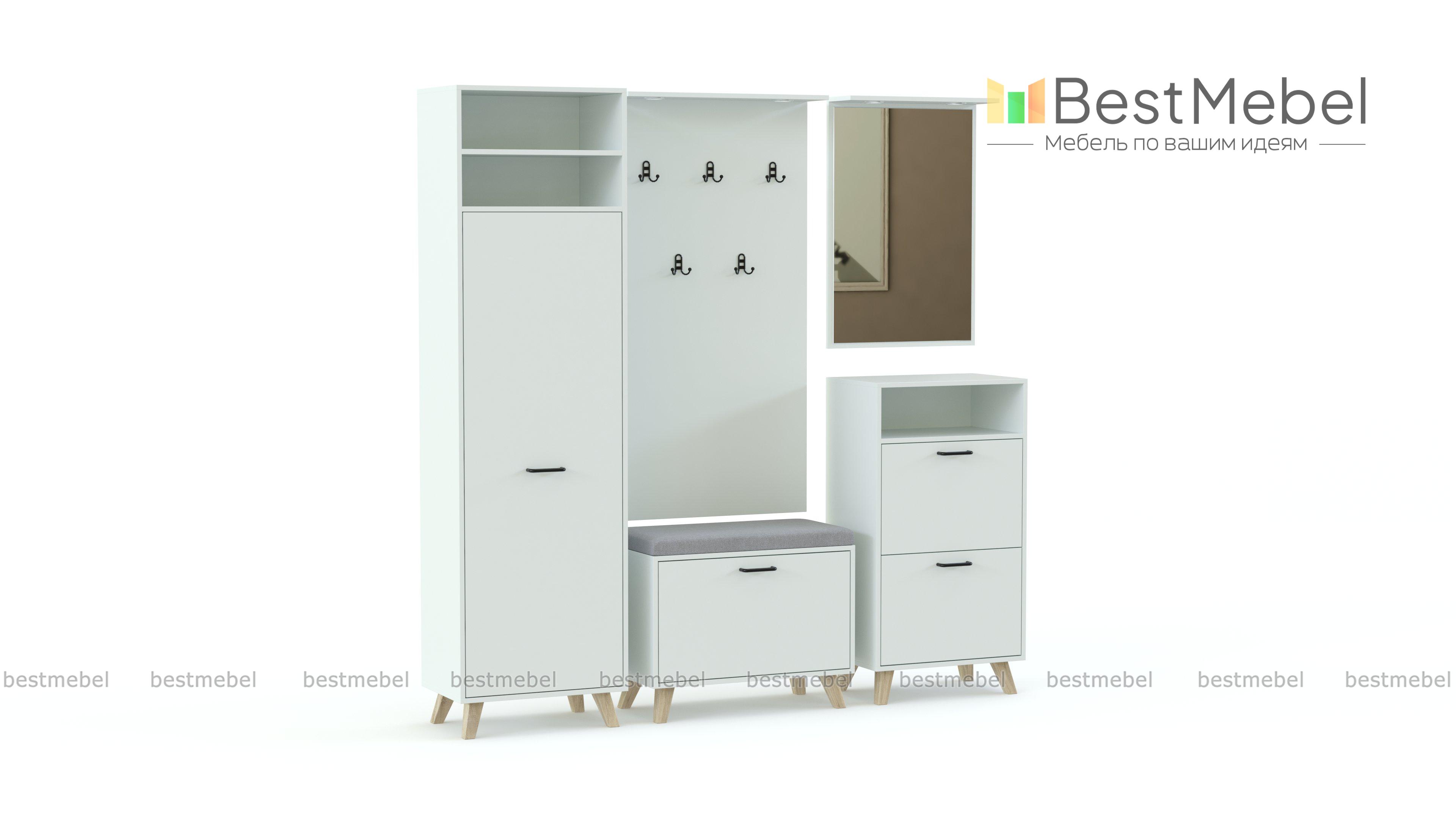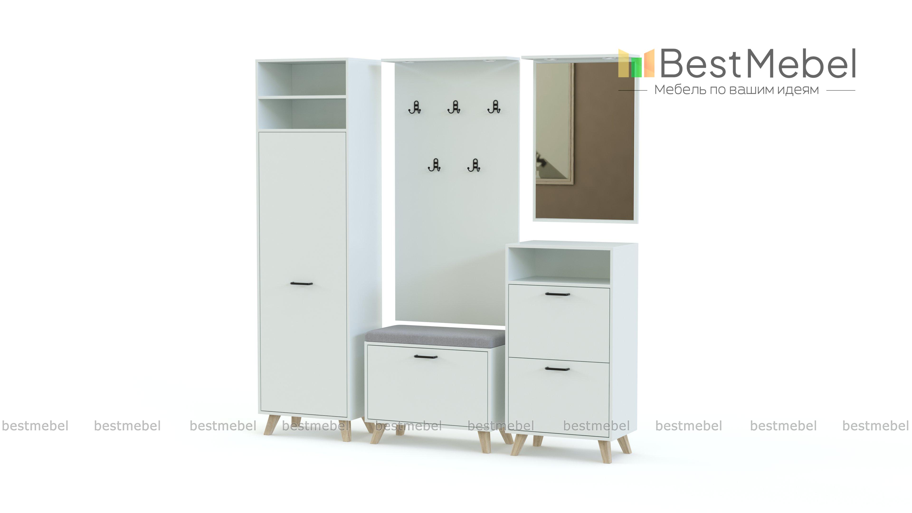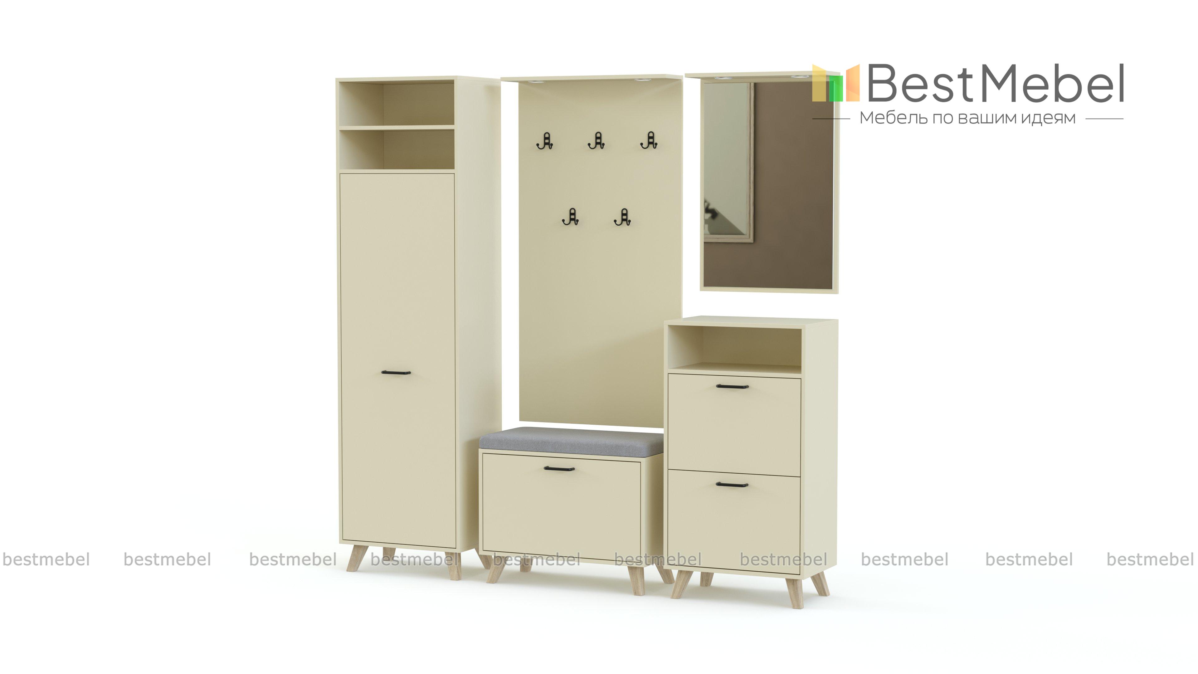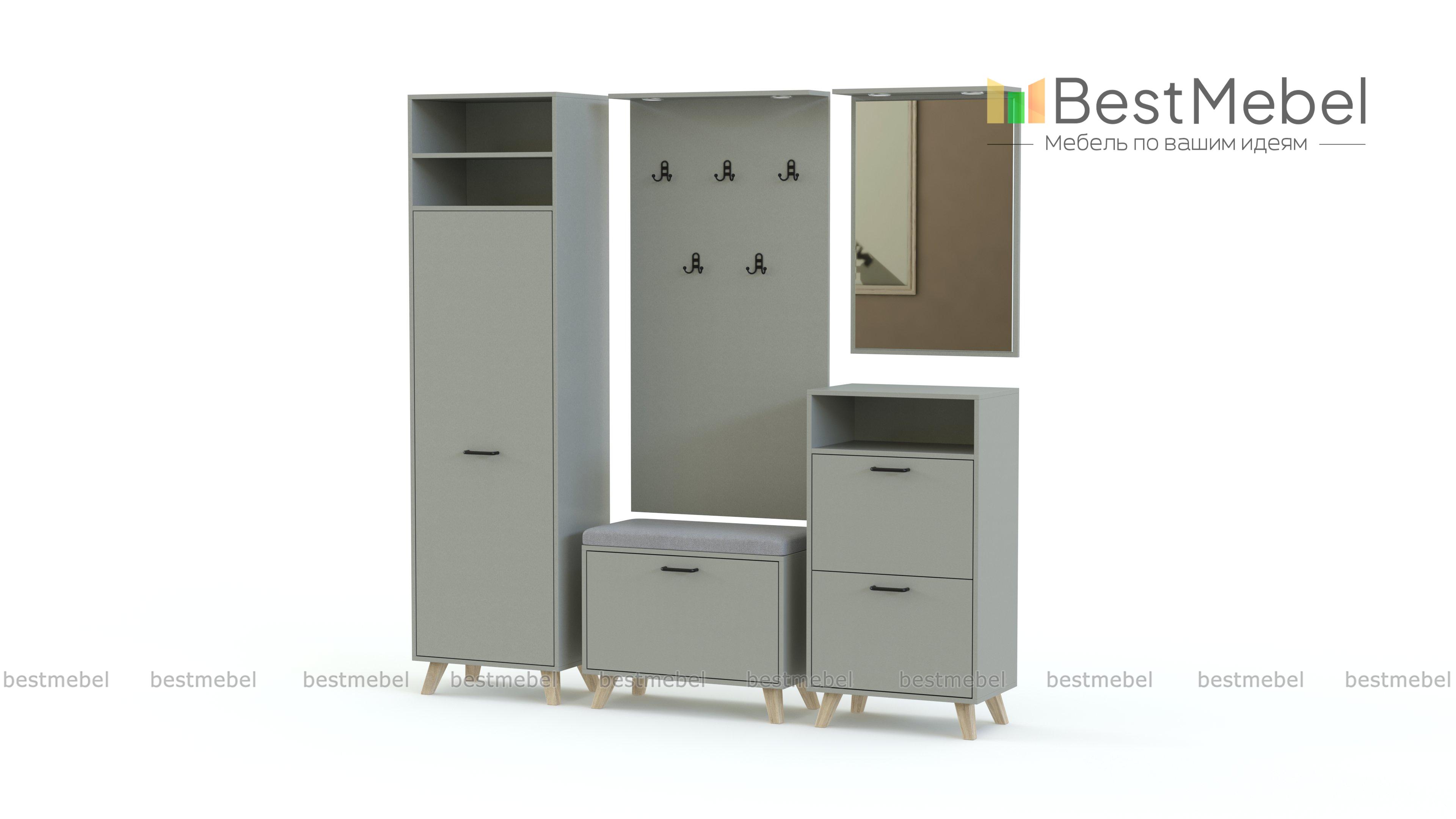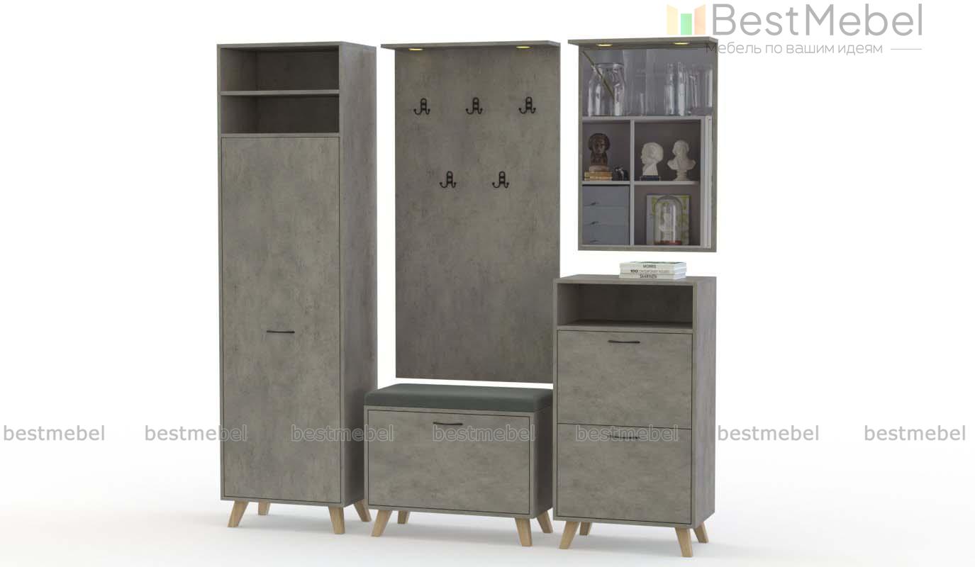 Прихожая Дастин 14.5 BMS сочетает в себе эргономичность и минималистичные формы с трендовыми нейтральными оттенками. В составе модульной композиции пенал, высокая тумба и обувница с деревянными скошенными ножками, открытая вешалка и навесное зеркало. Просторные ниши позволяют разместить аксессуары и важные мелочи, а встроенная в козырек подсветка делает пользование особенно комфортным. Купить прихожую Дастин 14.5 BMS вы сможете в нашем интернет-магазине с выбором фурнитуры и цвета по каталогу.