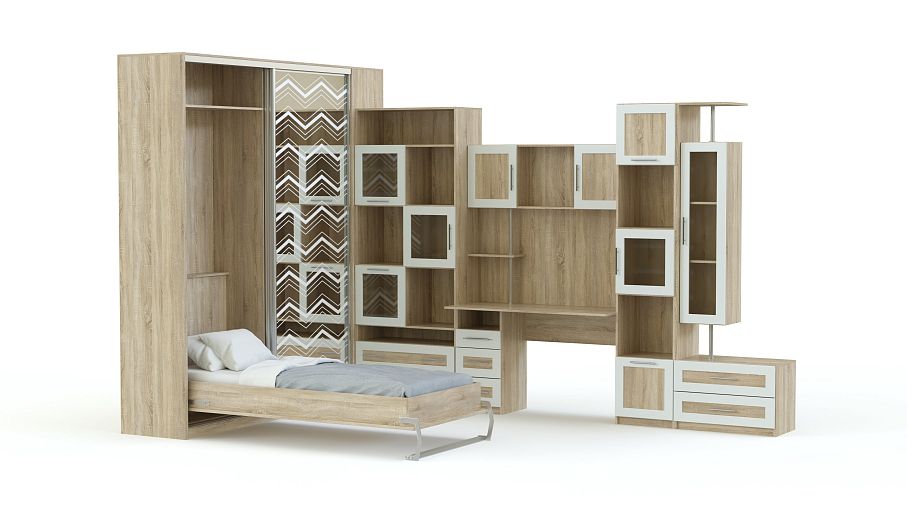 Шкаф-кровать трансформер Перу 26 BMS поможет получить просторную детскую днем и уютную спальню в ночное время. Двухдверный шкаф-купе оборудован вместительным отделением для одежды и нишей, в которой скрыта откидная кровать, легко опускающаяся вниз при помощи вертикального механизма. Полностью зеркальный фасад шкафа, декорированный пескоструйным рисунком, визуально расширит границы комнаты. Дополнение в виде рабочей зоны со стеллажами сделает интерьер максимально эргономичным. Купить шкаф-кровать трансформер Перу 26 BMS приглашаем к нам в интернет-магазин.