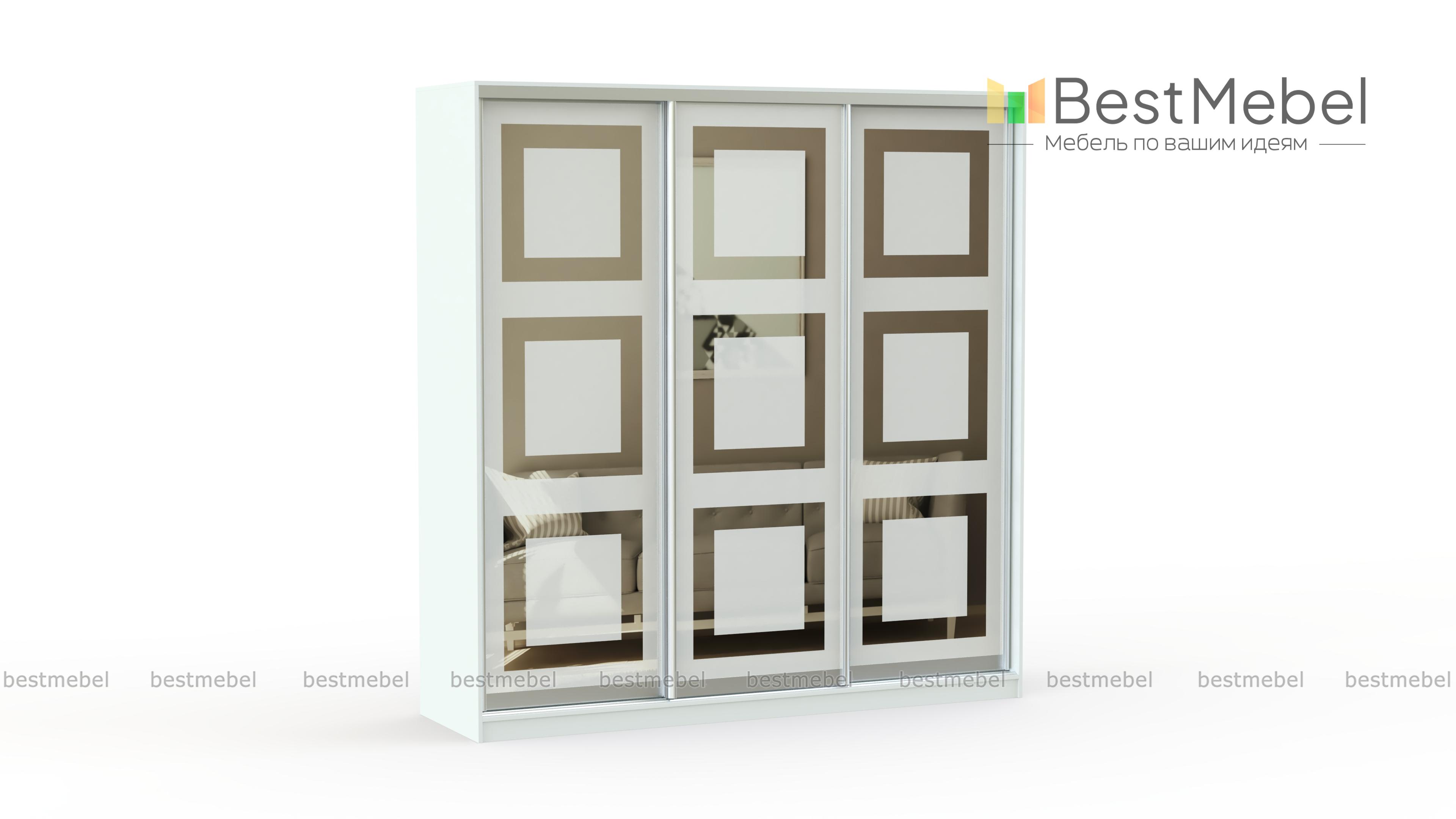 Шкаф-купе трехдверный Стандарт пескоструй BMS отличается крупными габаритами, вместительностью и эффектным дизайном фасадов. Раздвижные дверцы с зеркальными вставками, декорированными пескоструйным рисунком, станут украшением интерьера спальни, гостиной или просторной прихожей. Внутреннее наполнение шкафа из отделения со штангой и полок позволит без труда разместить одежду, обувь и аксессуары. Купить шкаф-купе трехдверный Стандарт пескоструй BMS, подобрав оптимальные параметры, вы сможете в нашем интернет-магазине.