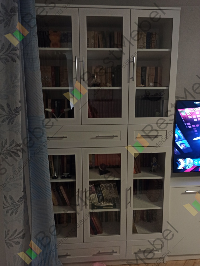 Отличный книжный шкаф. На полках разместилось около полутысячи книг, а в ящиках документы, фотоальбомы и прочие мелочи. Возможность выбрать размеры, конфигурацию и цвет сделал шкаф индивидуальным.