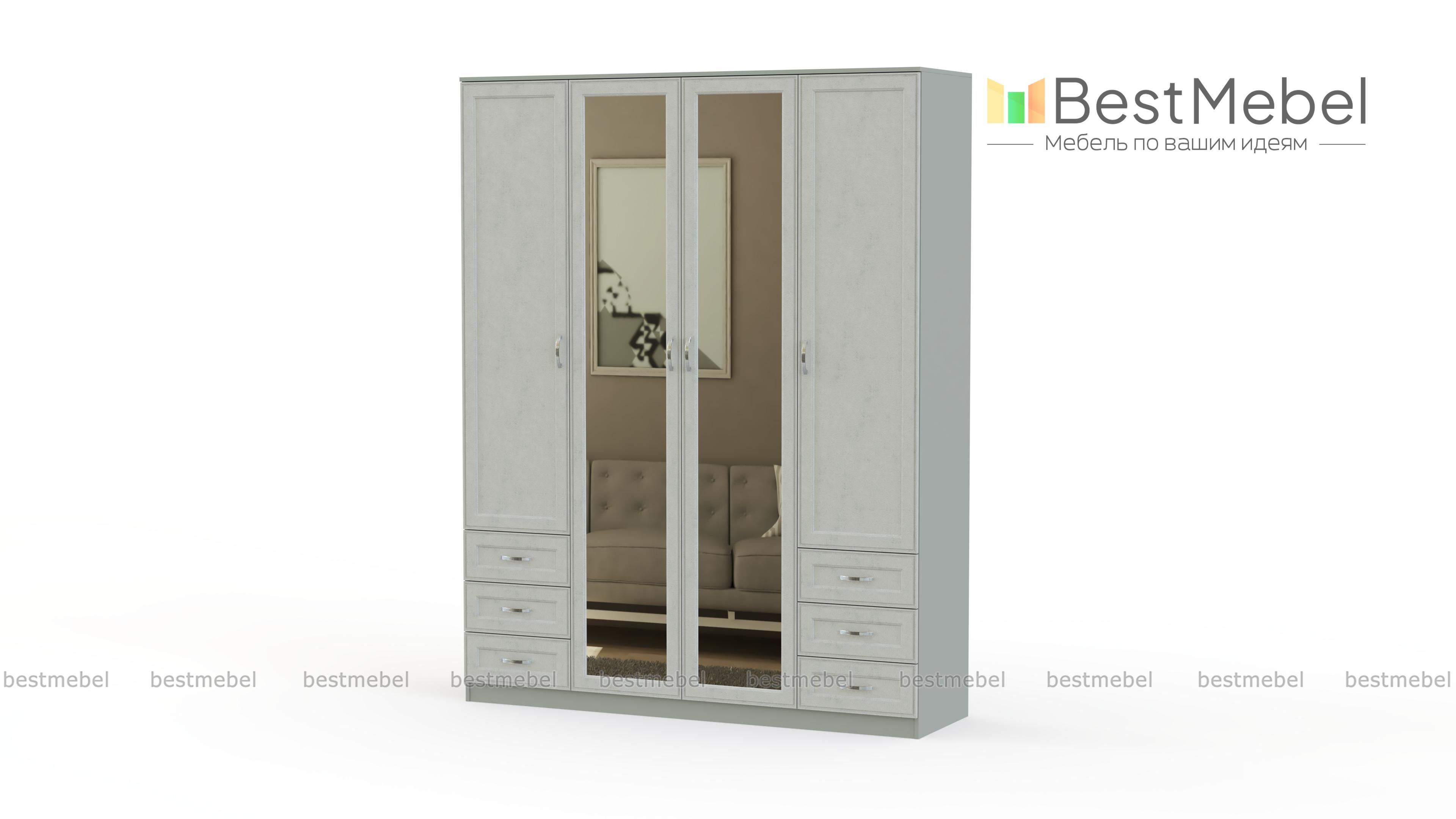 Распашной шкаф Габриэлла BMS с рамочными фасадами светлых тонов выполнен в классическом стиле. Удобная система хранения четырехдверной модели включает в себя распашные отделения со штангой и бельевыми полками, а также шесть выдвижных ящиков для мелочей. Зеркала в центральной части визуально облегчают интерьер, незаменимы для примерки одежды и ухода за собой. Купить распашной шкаф Габриэлла BMS для меблировки спальни вы сможете в нашем интернет-магазине.