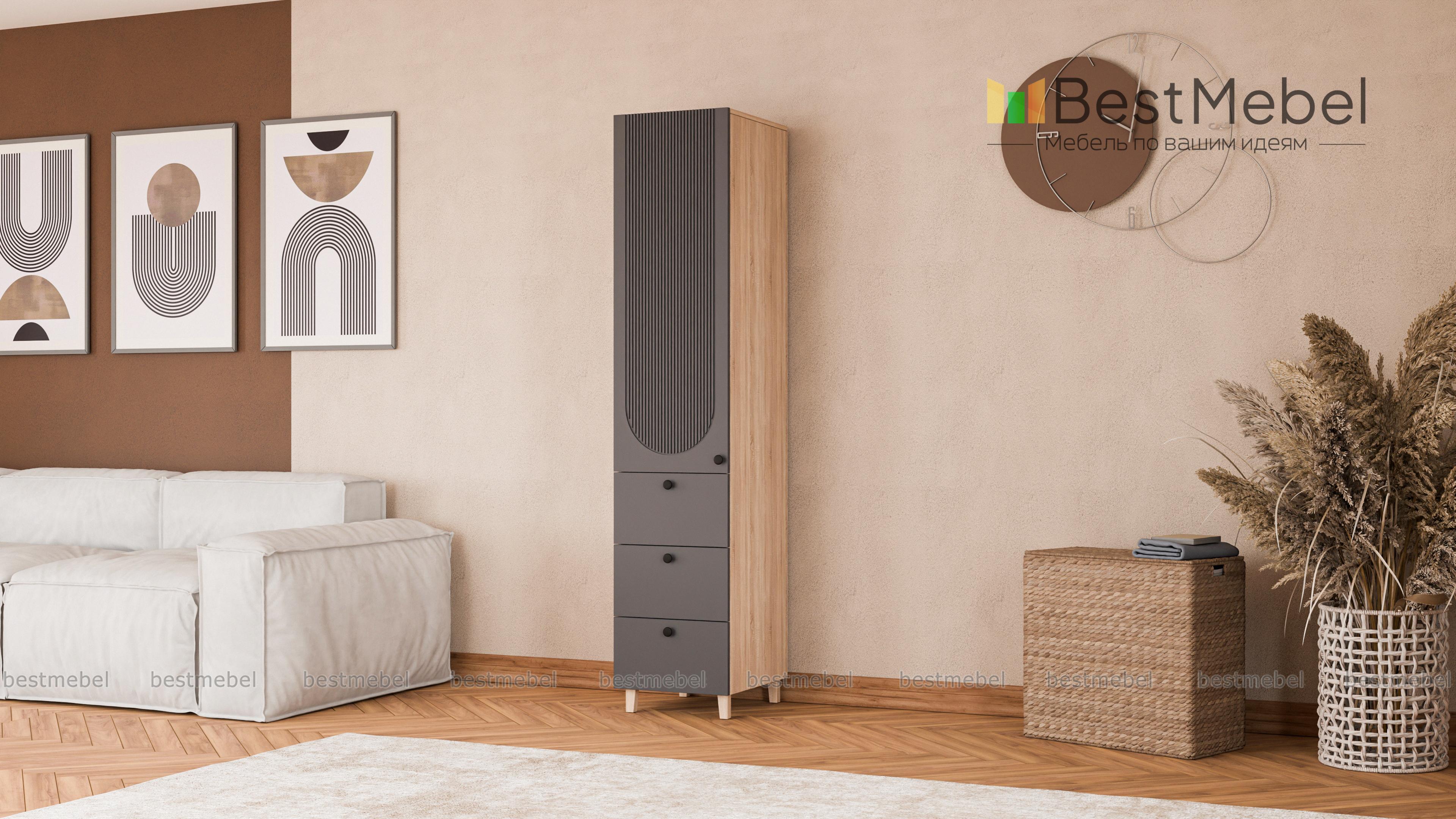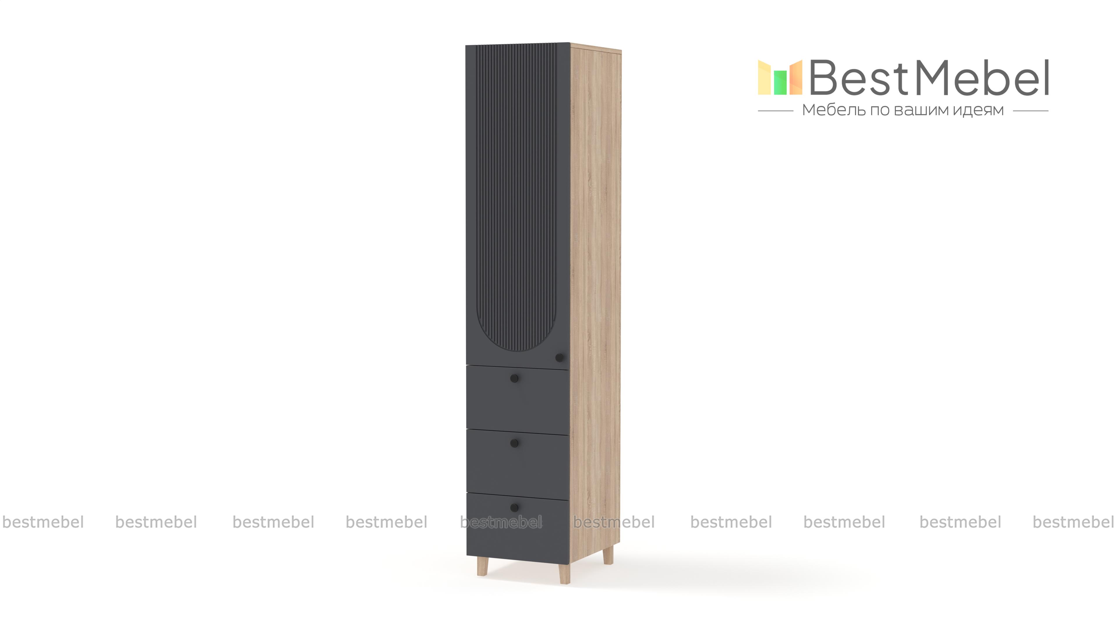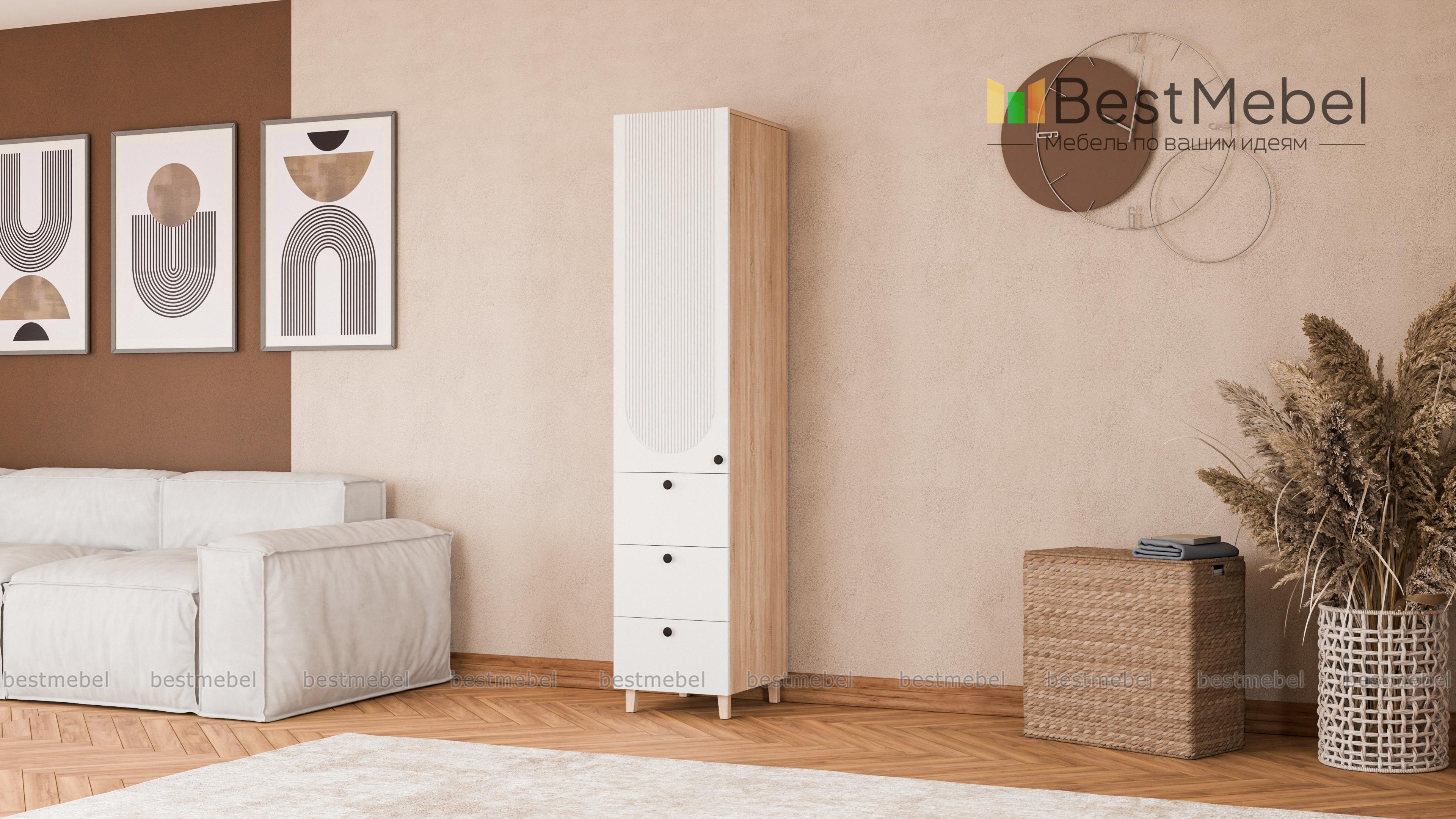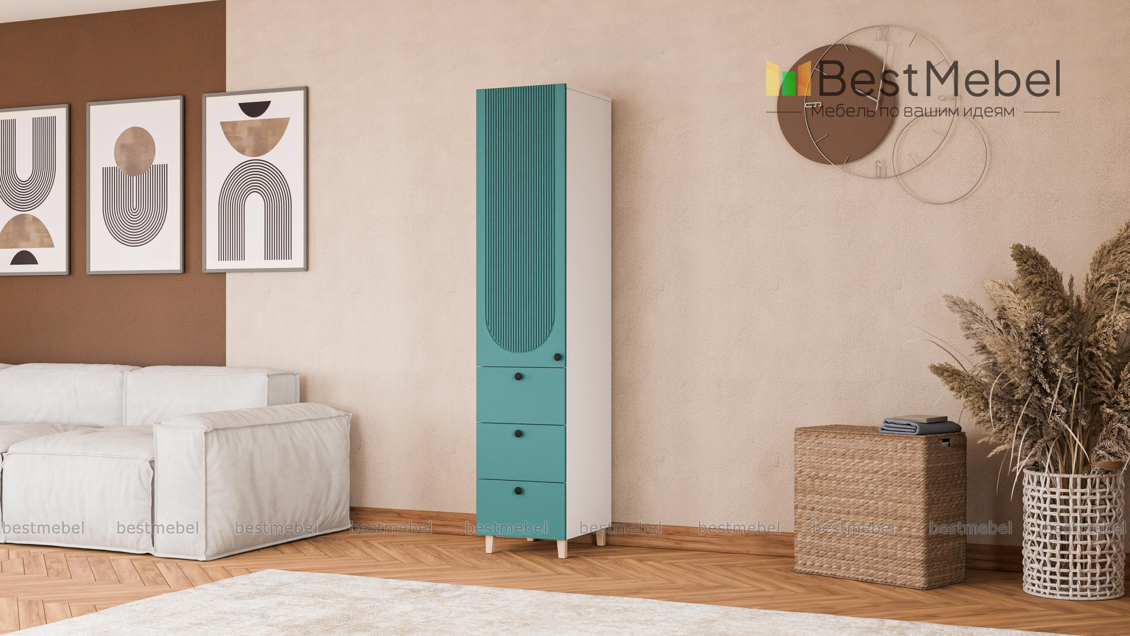 Шкаф-пенал Рене 10 BMS сделает простым и удобным хранение одежды, домашнего текстиля, материалов для работы и творчества. Комбинированная модель оборудована распашной секцией сверху и тремя выдвижными ящиками, расположенными в основании. Лаконичный светлый дизайн оживляют стильные детали: высокие ножки, фрезерованный декор и контрастные круглые ручки. Купить шкаф-пенал Рене 10 BMS с индивидуальным подбором цвета и габаритов приглашаем в наш интернет-магазин.