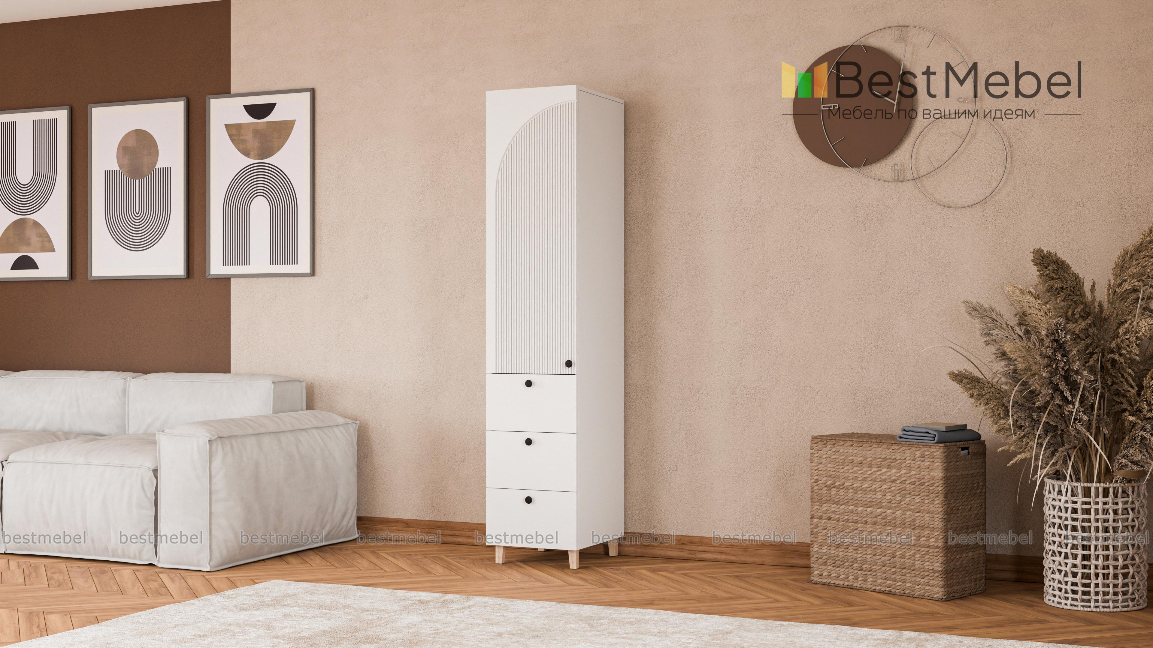 Шкаф-пенал Вивьен 1 BMS с опорами в стиле сканди универсален и отлично справляется с хранением одежды и текстиля для дома, учебных пособий, игрушек и кухонной утвари. Под распашной секцией с полками расположились три вместительных ящика с легким выдвижением. Покрытие корпуса и фасада отличается износостойкостью, а для декора использована стильная асимметричная фрезеровка. Купить шкаф-пенал Вивьен 1 BMS с выбором размеров, цвета и фурнитуры вы сможете недорого в нашем интернет-магазине.