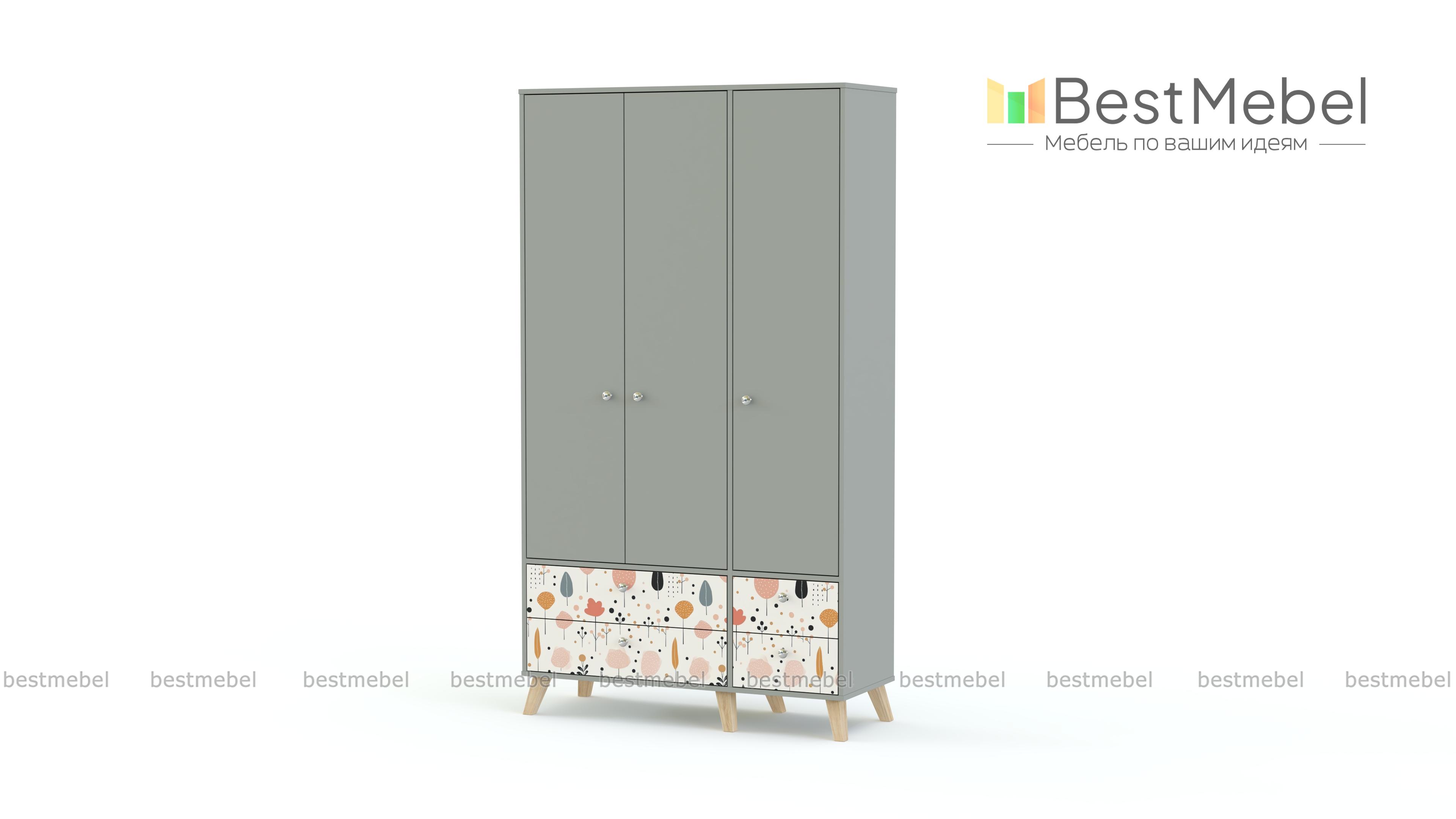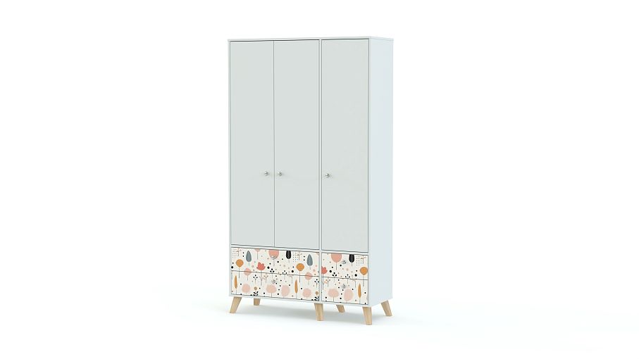 Шкаф распашной Эльза 5 BMS с деревянными ножками вы сможете использовать самостоятельно или в комплекте с другими предметами коллекции. Трехдверный шкаф в детскую оборудован полками и штангой, а в нижней части располагаются два больших и два малых выдвижных ящика. Модель в универсальном светлом оформлении украшена по фасаду нежным рисунком-фотопечатью. Купить шкаф распашной Эльза 5 BMS, изготовленный по вашим размерам, приглашаем к нам в интернет-магазин.