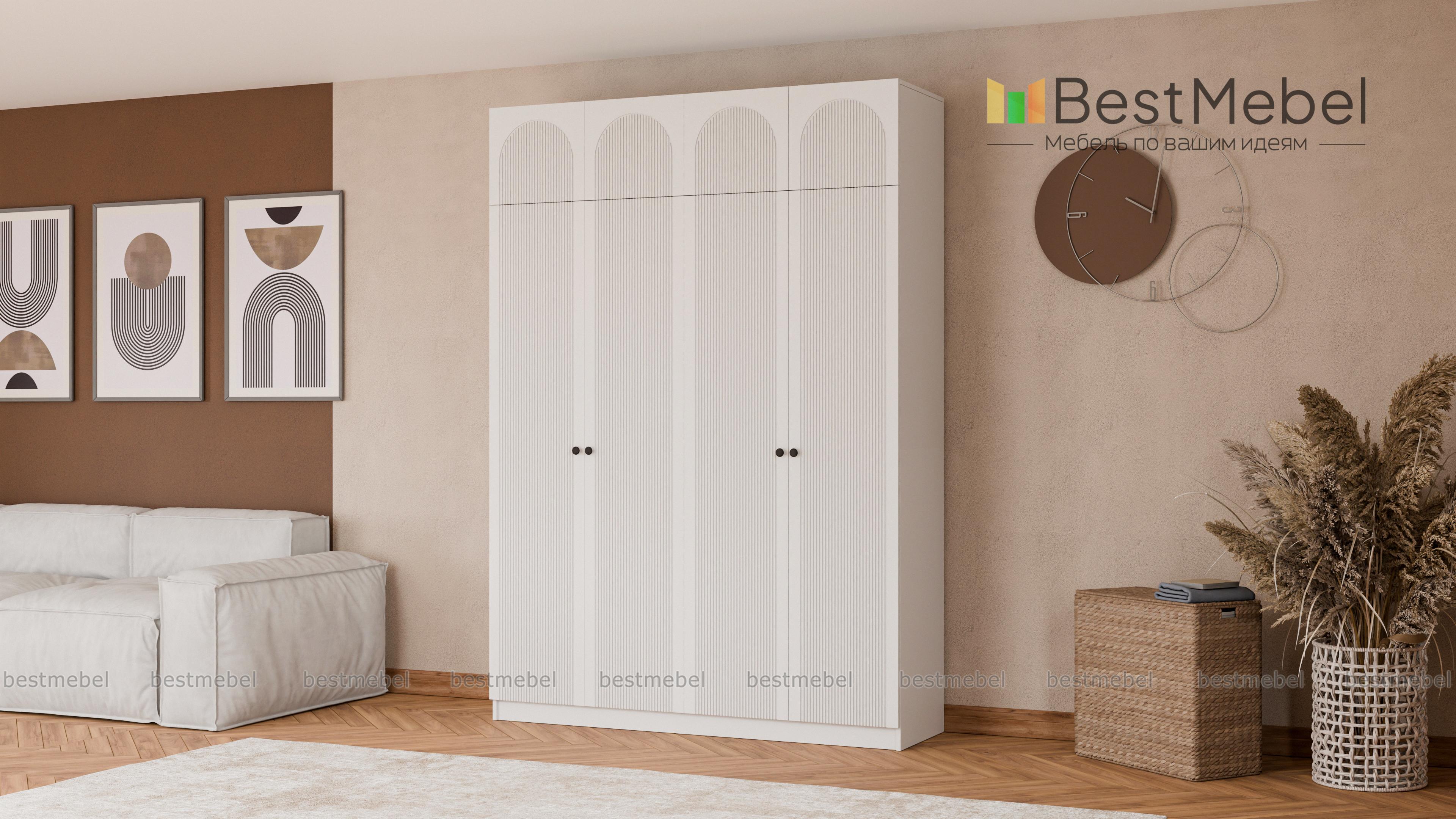 Шкаф распашной Рене 27 BMS дополнен антресолью, что позволяет выгодно использовать пространство спальни или прихожей. В одном месте могут храниться повседневный гардероб и те вещи, которыми вы редко пользуетесь. Особенность дизайна четырехдверной модели — рифленый фасад с геометрическим рисунком, выполненный из устойчивой к влаге и механическим повреждениям плиты МДФ. Купить шкаф распашной Рене 27 BMS с выбором габаритов, цвета и наполнения приглашаем в наш интернет-магазин.