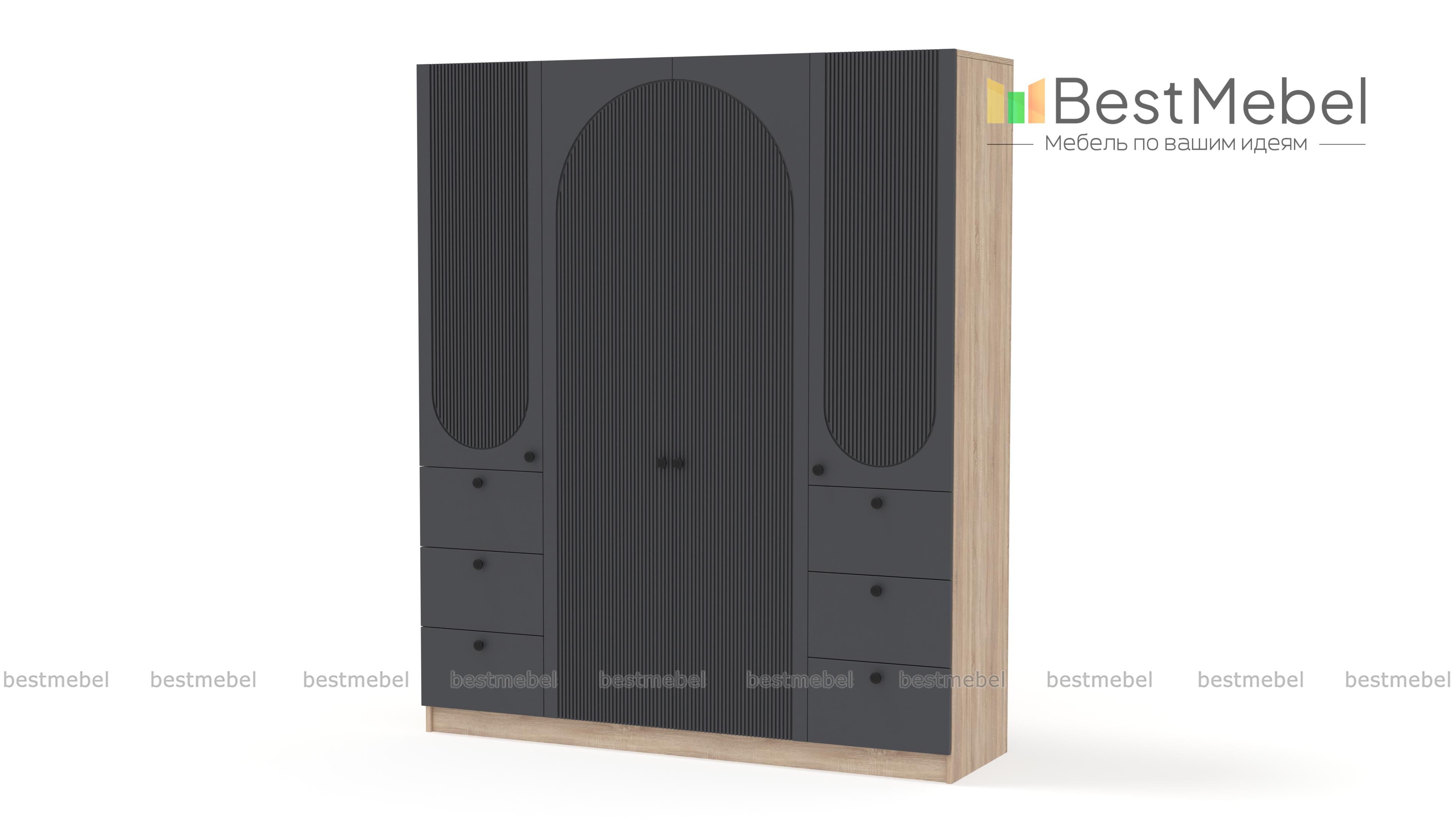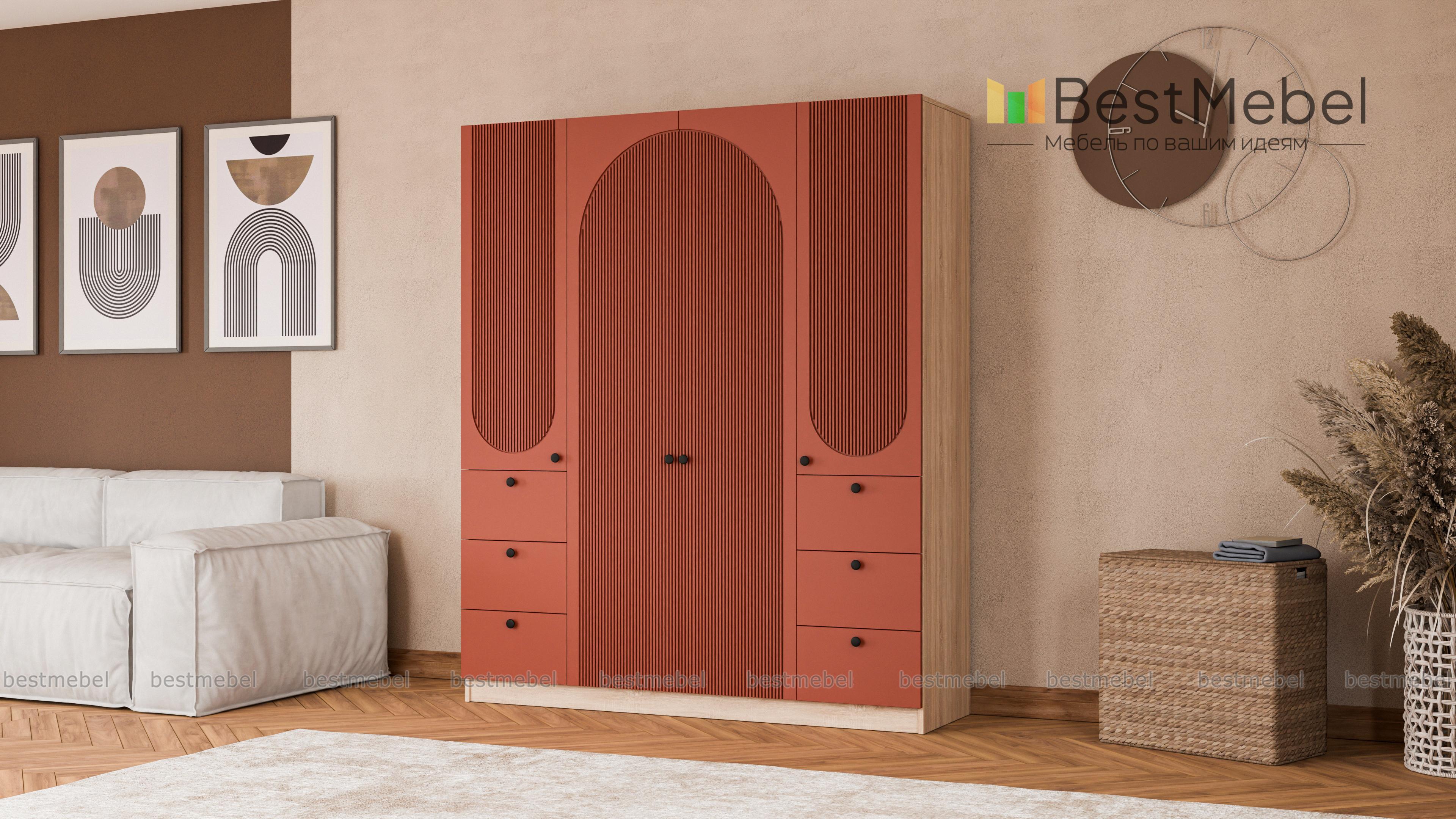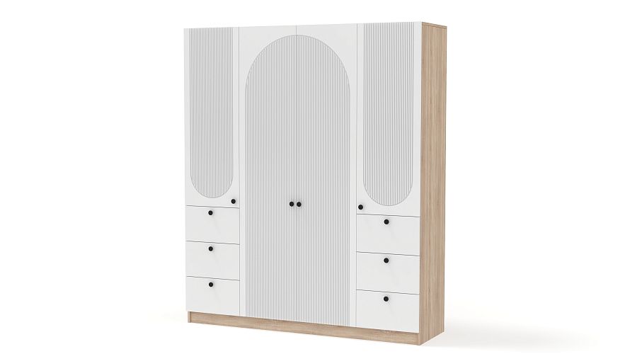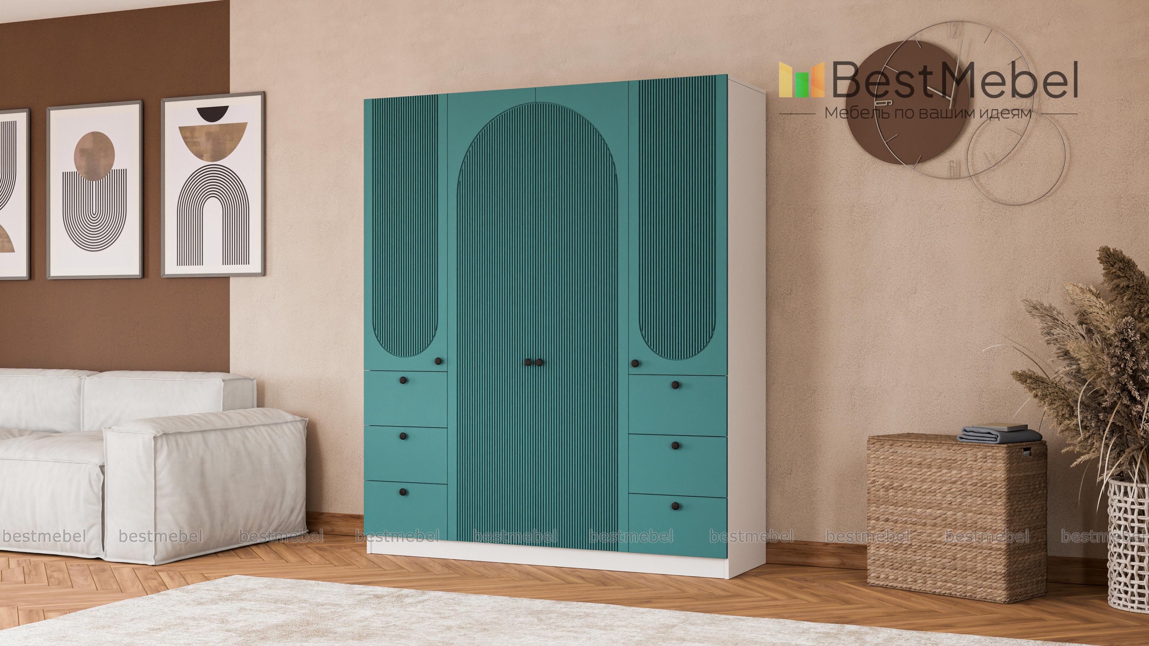 Шкаф распашной Вивьен 13 BMS гармонично смотрится в современном интерьере и обладает удобным функционалом. Отделение для вешалок за двумя дверцами в центре, а по бокам — закрытые бельевые полки и выдвижные ящики для мелкого трикотажа и аксессуаров. Модель с глухими дверцами не выглядит громоздко благодаря светлому оттенку фасада и изящному арочному рельефу. Купить шкаф распашной Вивьен 13 BMS вы сможете в нашем интернет-магазине, подобрав фурнитуру и цвет по своему вкусу.