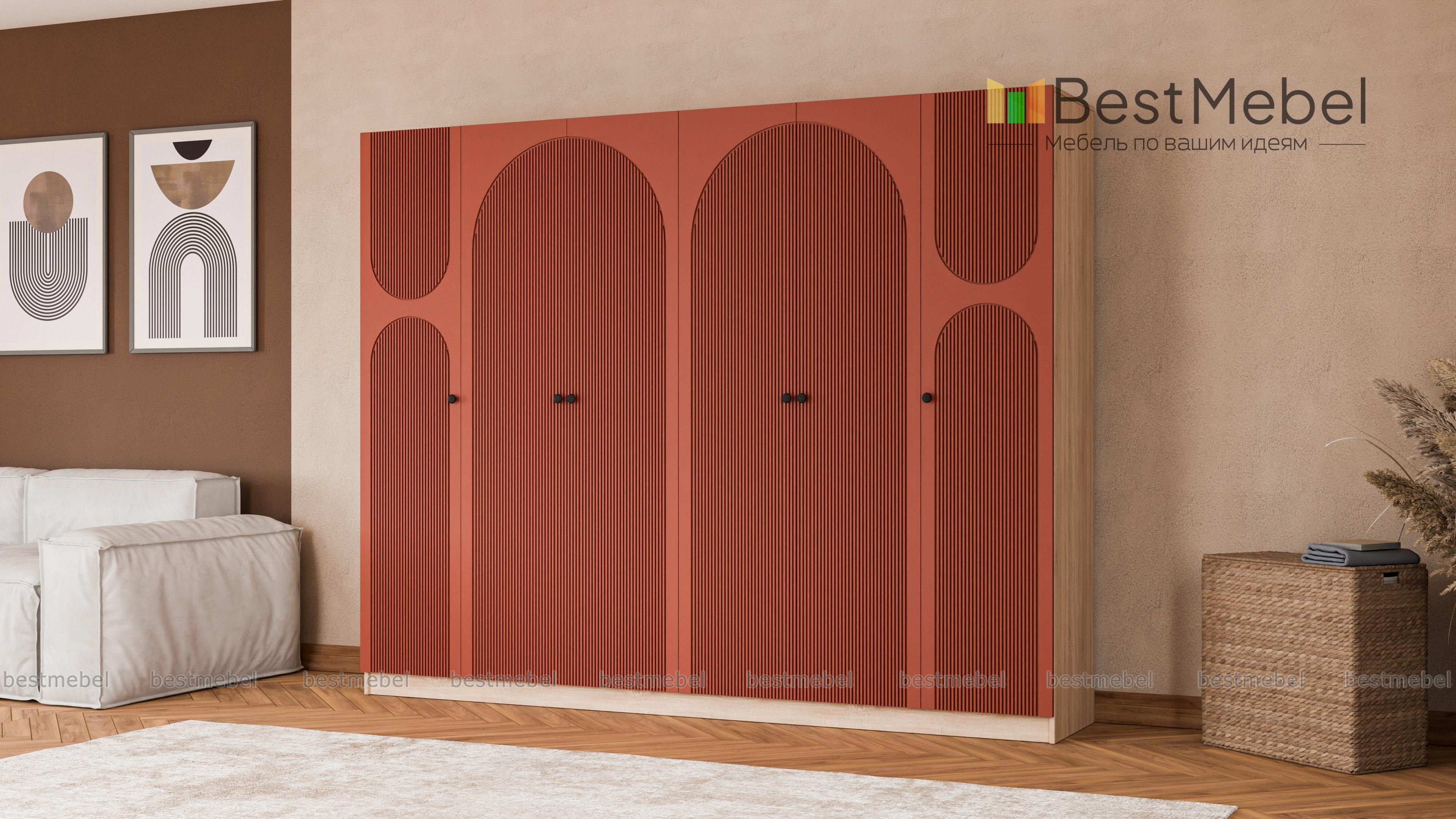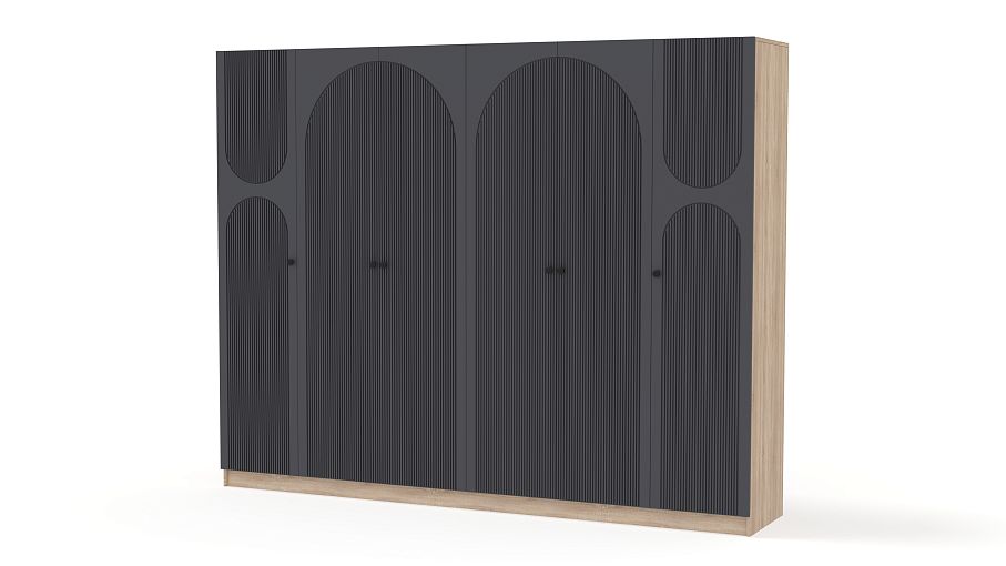 Шкаф распашной Вивьен 17 BMS оборудован двухдверными секциями в центре и однодверными — по бокам. Благодаря распашной конструкции створок вы сразу видите содержимое полок и штанг. Для корпуса габаритного шестидверного шкафа использована прочная ламинированная плита с древесной фактурой, эффектный темный фасад украшает оригинальный рельеф. Купить шкаф распашной Вивьен 17 BMS вы сможете в нашем интернет-магазине, подобрав размеры, ручки, оттенки корпуса и фасада.