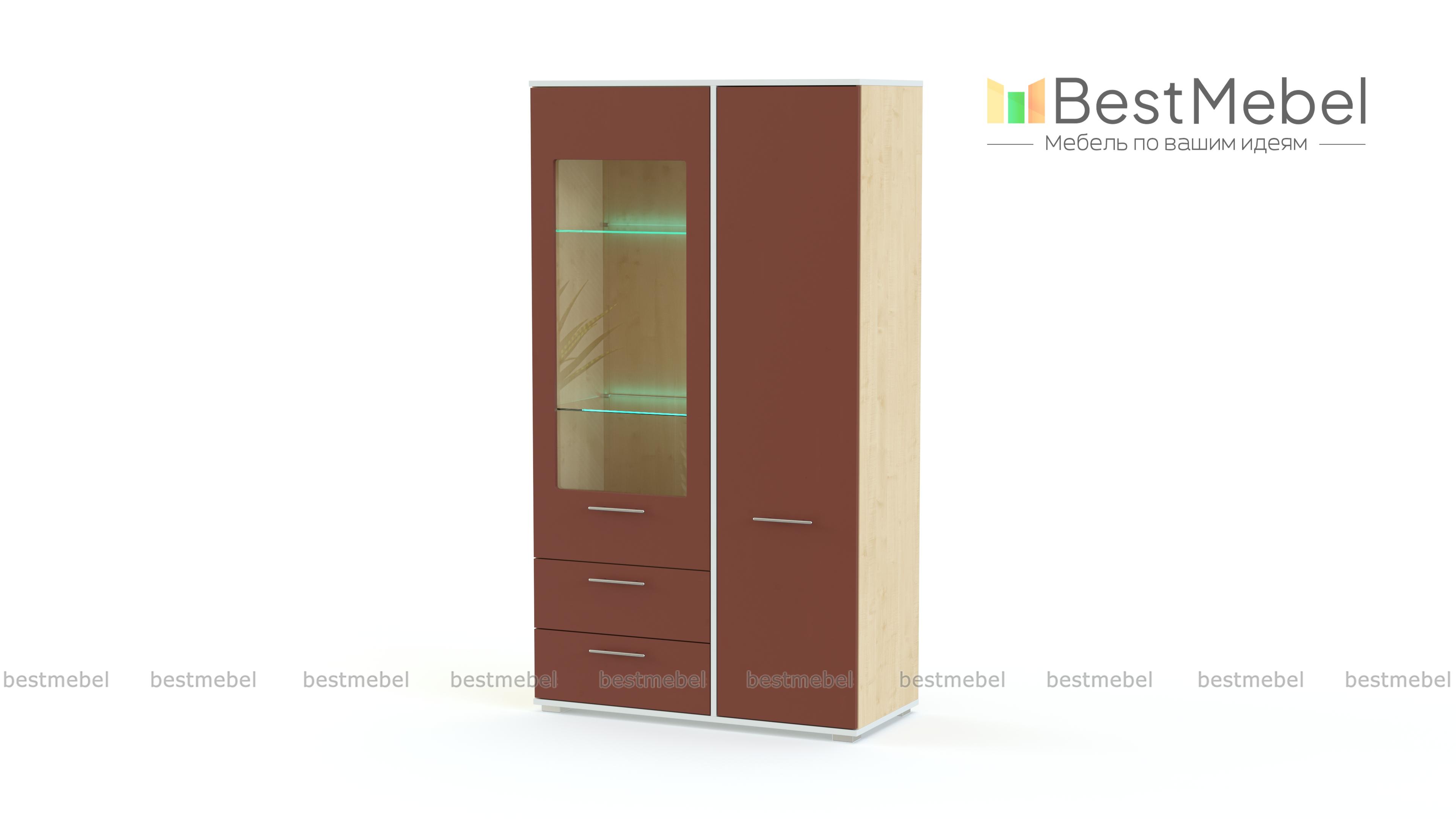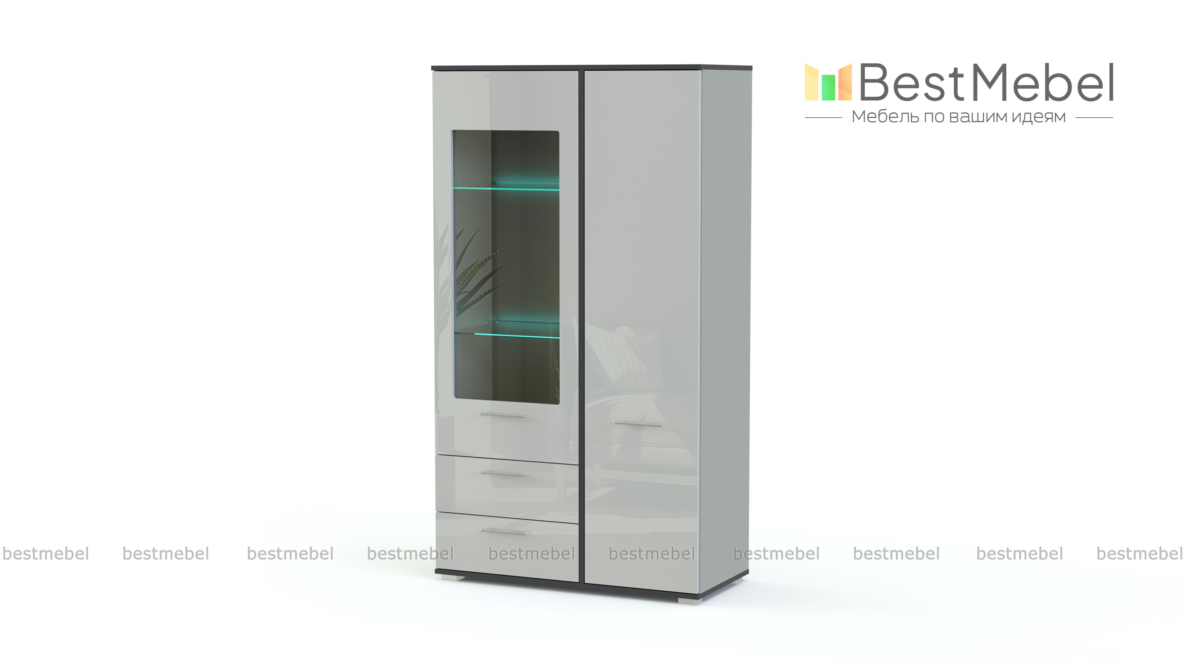 Витрина Энио BMS станет оригинальным акцентом в интерьере гостиной или столовой. Компактная модель в темных графитовых тонах с контрастной окантовкой будет уместна и в классическом, и в современном интерьере. Благодаря комбинированной конструкции витрина позволит разместить не только посуду и предметы декора, но и множество бытовых мелочей в выдвижных ящиках и распашном отделении. Купить Витрину Энио BMS недорого вы сможете в нашем интернет-магазине.