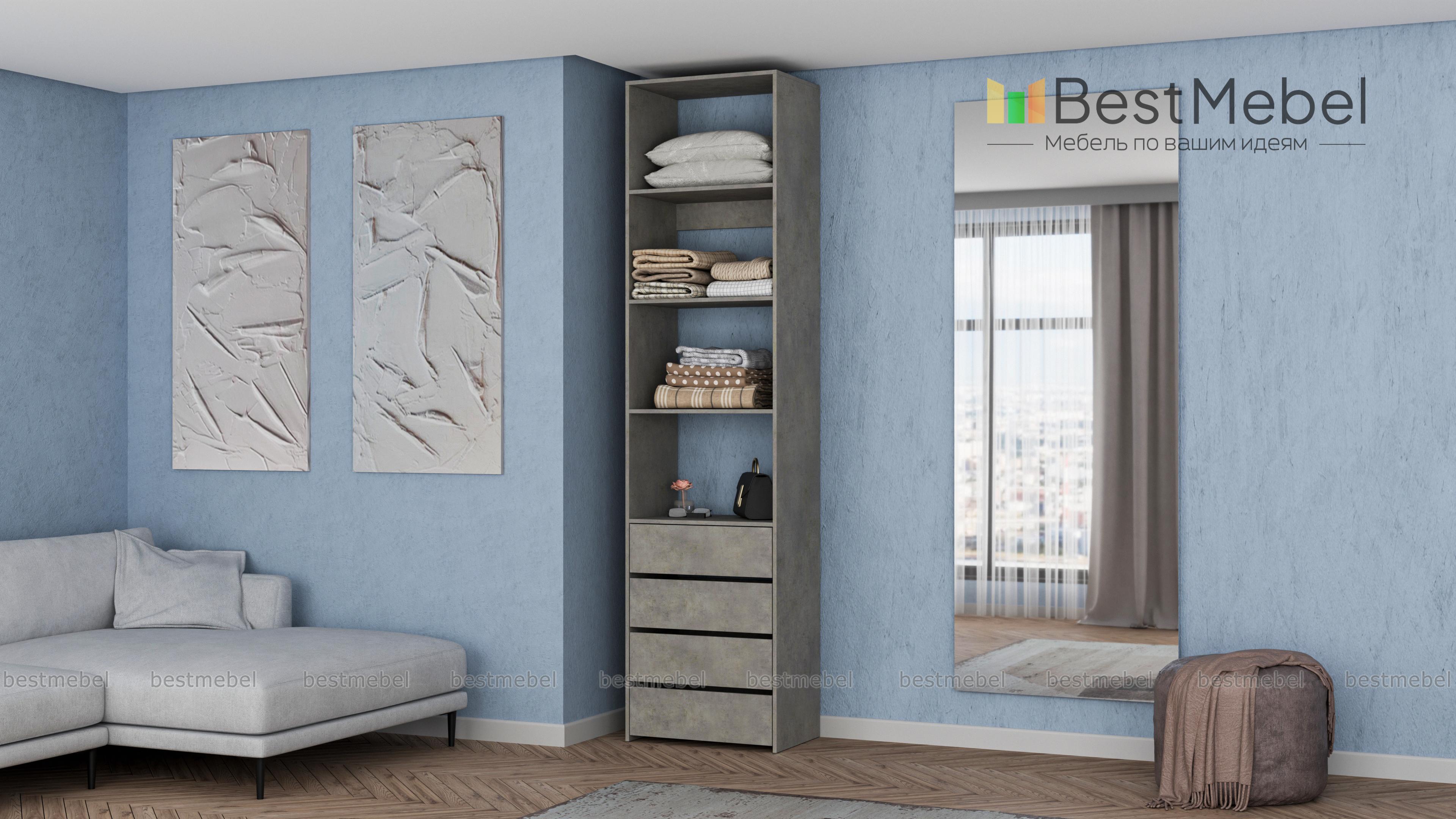 Стеллаж для одежды Мирта 35 BMS может дополнить другие стеллажи серии или использоваться самостоятельно. Три бельевые полки сверху дополнены четырьмя выдвижными ящиками для трикотажа, аксессуаров и прочих мелких вещей. Узкий стеллаж легко вписывается в ниши, маленькие спальни, прихожие или гардеробные, решая проблему ограниченного пространства. Купить стеллаж для одежды Мирта 35 BMS приглашаем в наш интернет-магазин в любом размере и оттенке из каталога.