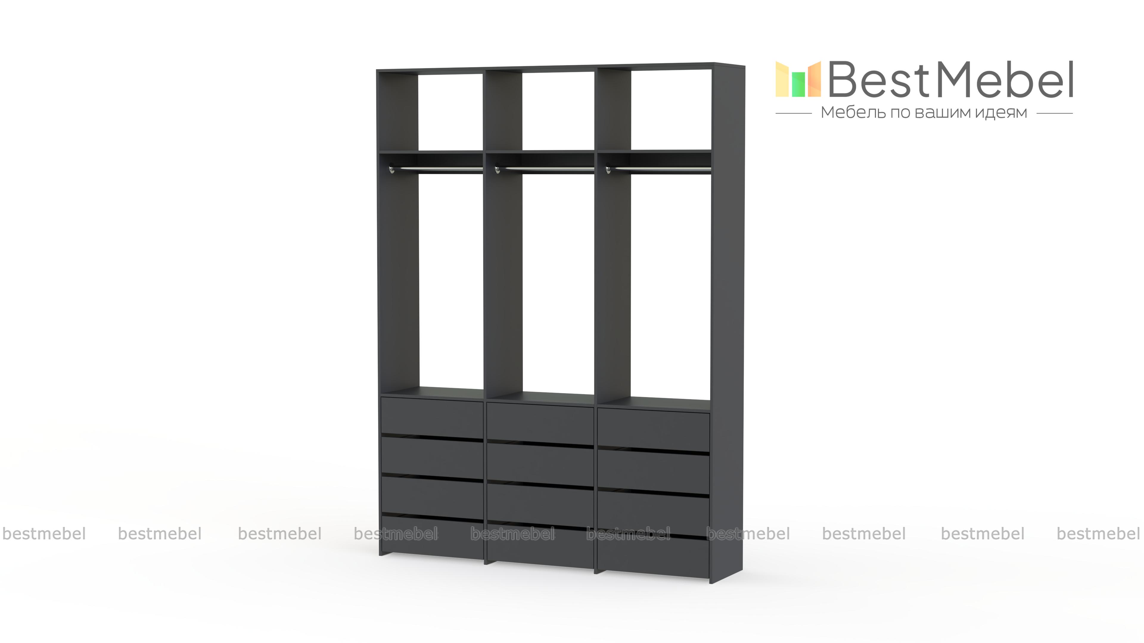 Стеллаж для одежды Мирта 47 BMS выполнен из прочной ламинированной ДСП и включает в себя три секции. В нижней части располагаются выдвижные ящики для текстиля и аксессуаров, средняя занята платяными штангами, а верхняя — полками для несезонных вещей. Минималистичный дизайн позволяет стеллажу легко вписаться в существующий интерьер. Купить стеллаж для одежды Мирта 47 BMS, изготовленный по индивидуальным размерам, вы сможете в нашем интернет-магазине.