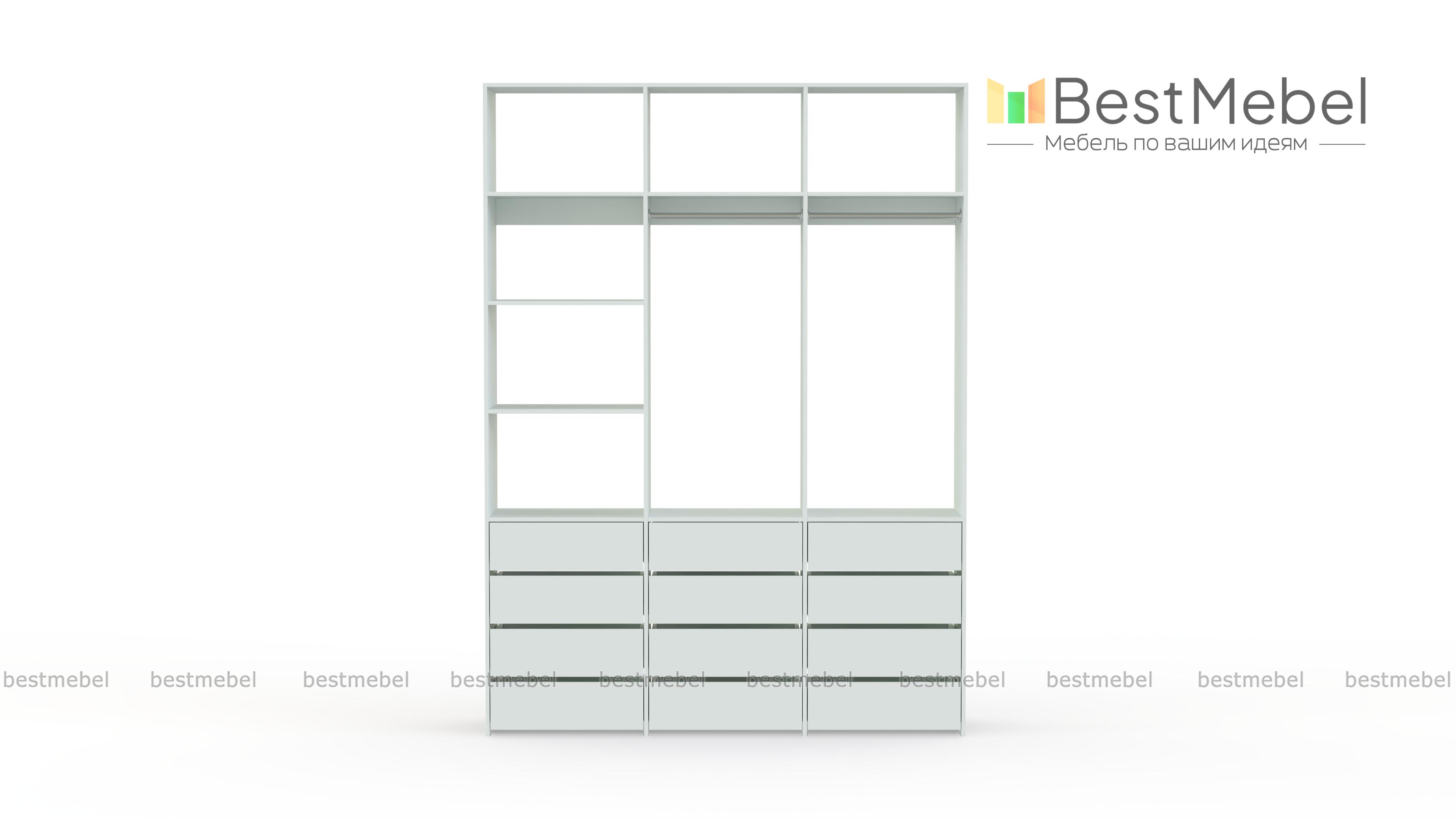 Стеллаж для одежды Мирта 48 BMS имеет минималистичный и функциональный дизайн. Трехсекционная конструкция включает в себя штанги для вешалок с одеждой, выдвижные ящики для белья и верхние полки, отделение слева для удобства также разделено двумя полками. Материал изготовления — прочная и долговечная ламинированная плита. Купить стеллаж для одежды Мирта 48 BMS, выполненный по индивидуальным размерам, вы сможете недорого на сайте нашего интернет-магазина.