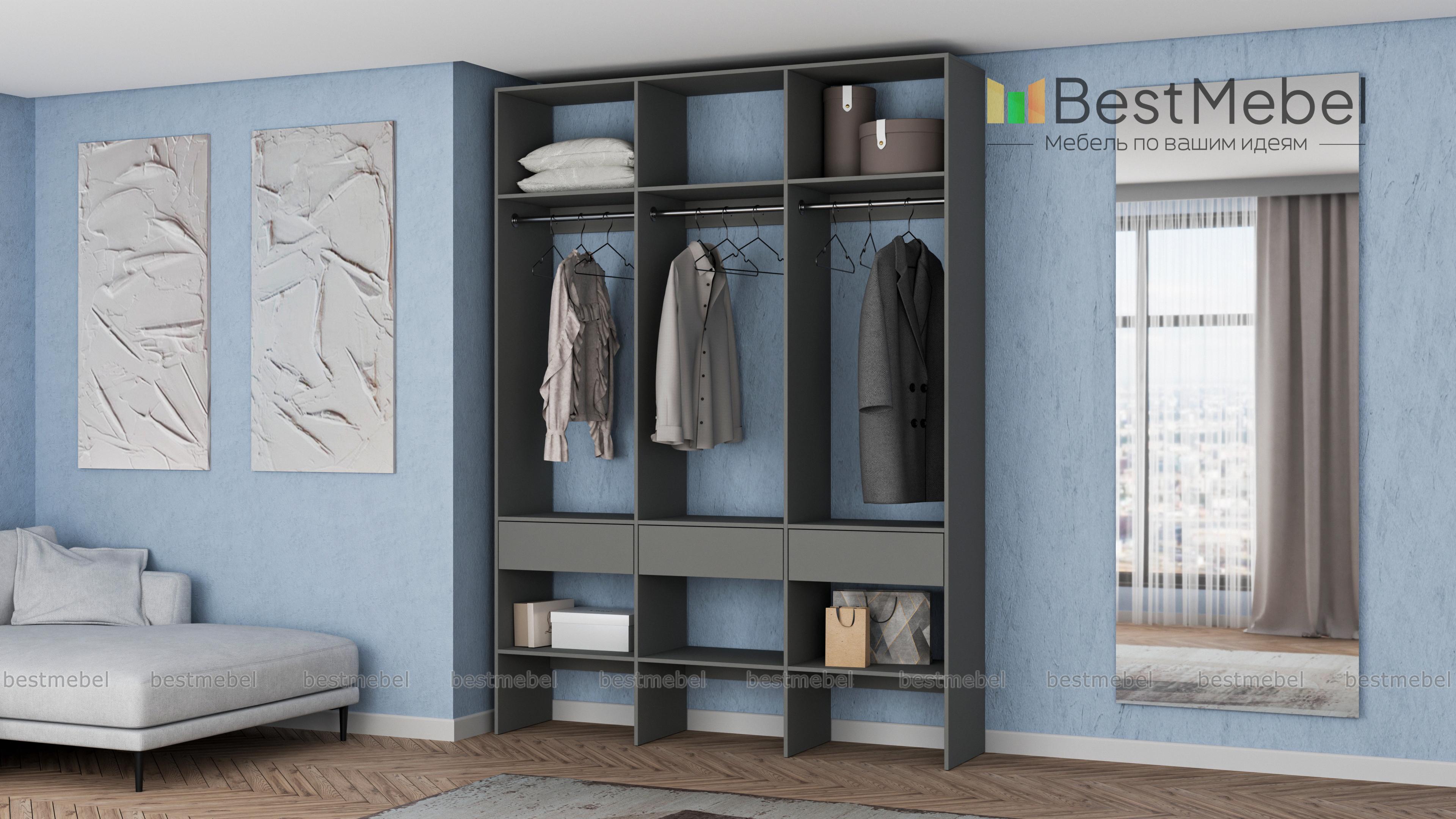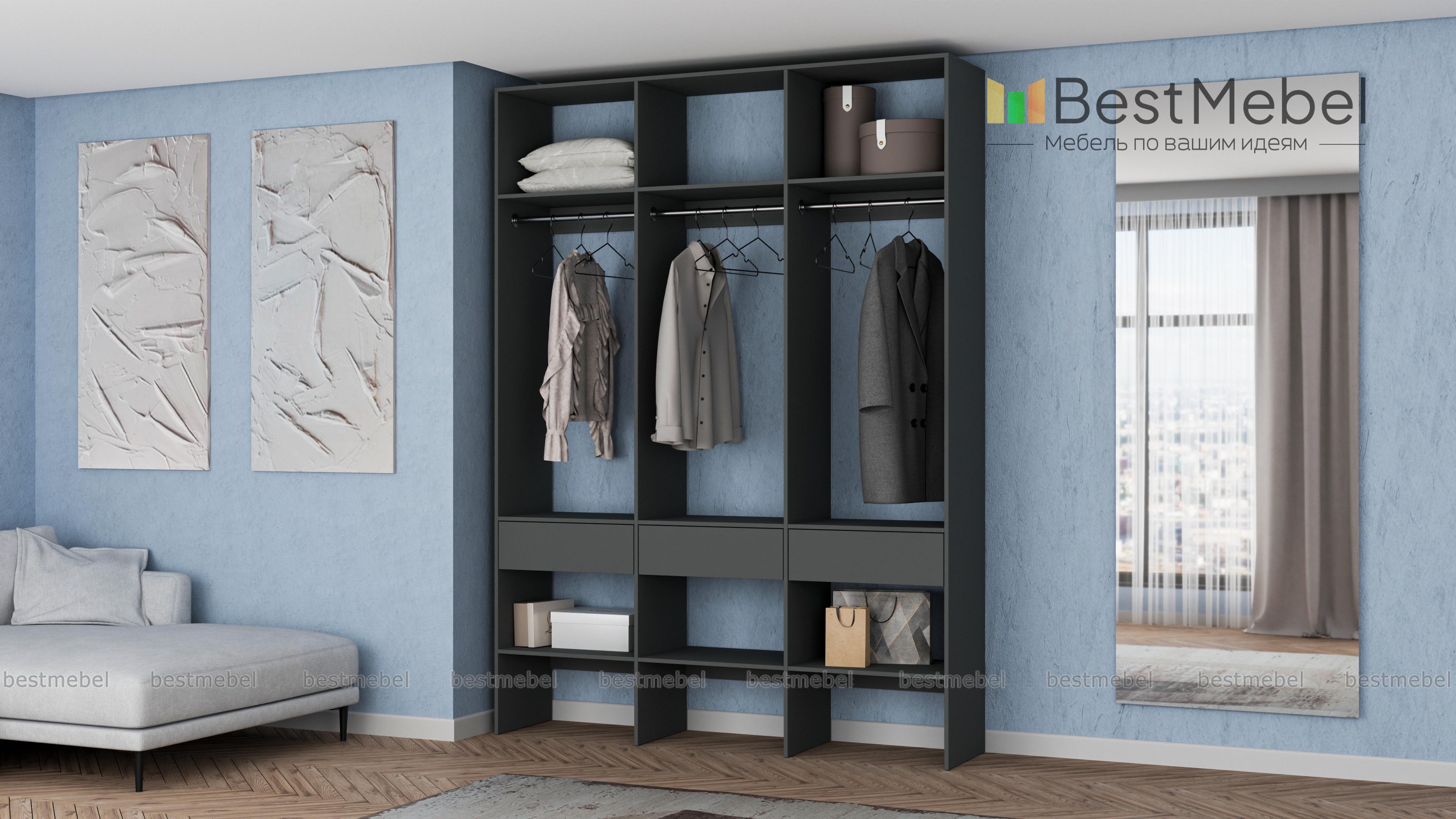 Стеллаж для одежды Мирта 51 BMS — визуально легкая и надежная конструкция из ламинированной ДСП, которую легко вписать в интерьер. Трехсекционный стеллаж прекрасно подходит для современных прихожих и гардеробных. Для вашего удобства три бельевых ящика и обувные полки располагаются снизу, а пространство над штангами занято полками для редко используемых вещей. Купить стеллаж для одежды Мирта 51 BMS вы сможете на сайте нашего интернет-магазина, подобрав цвет и размеры.