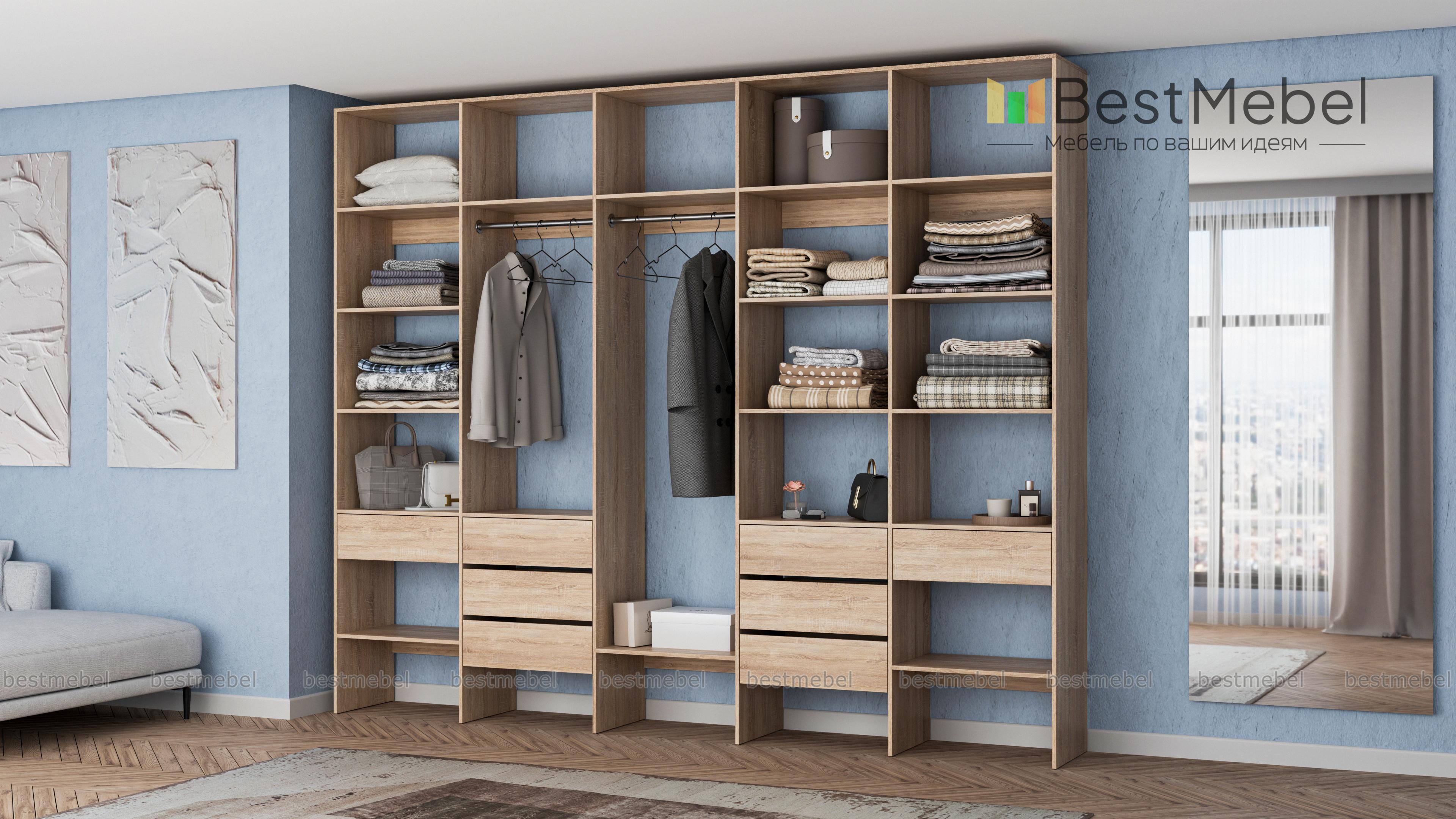 Стеллаж для одежды Мирта 72 BMS поможет вам обустроить зону для хранения вещей. Пять секций стеллажа оборудованы полками, двумя штангами и комбинацией из восьми выдвижных ящиков, позволяя выделить зоны для разных типов одежды, обуви и аксессуаров. Ламинированная ДСП в сочетании с качественной фурнитурой создает долговечную и эстетичную конструкцию. Купить стеллаж для одежды Мирта 72 BMS, подобрав оптимальные размеры и оттенок для вашего интерьера, приглашаем в наш интернет-магазин.