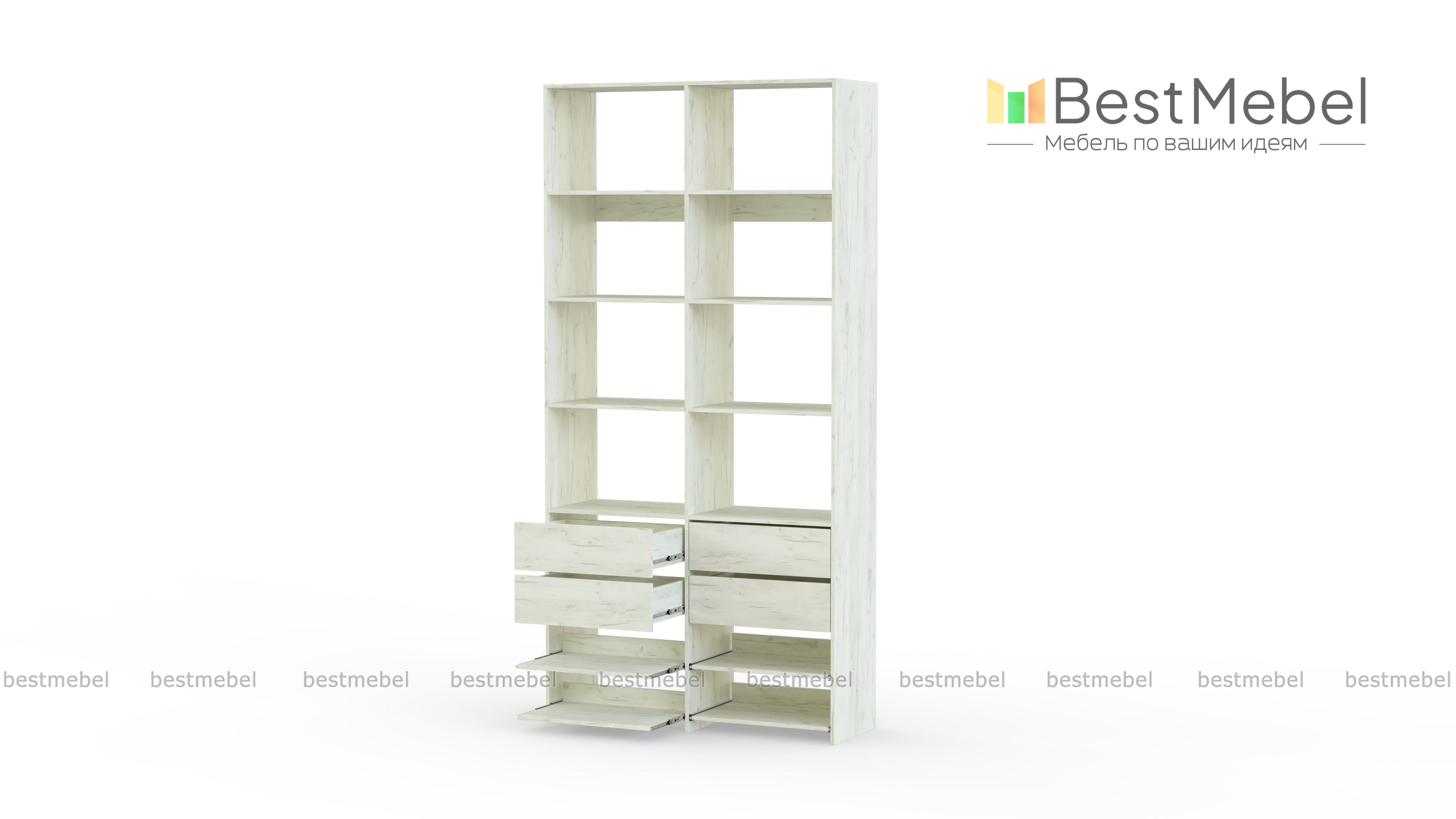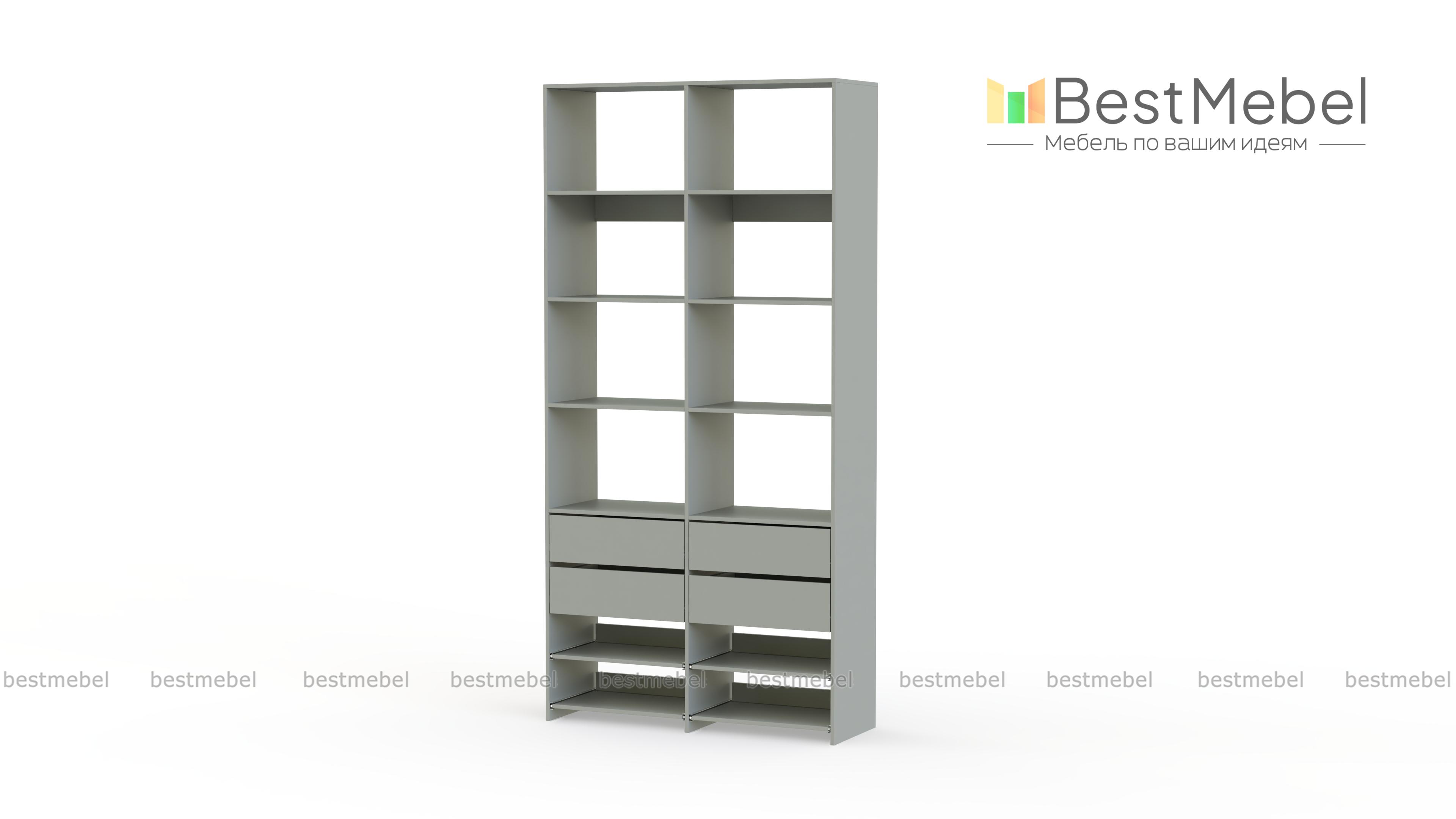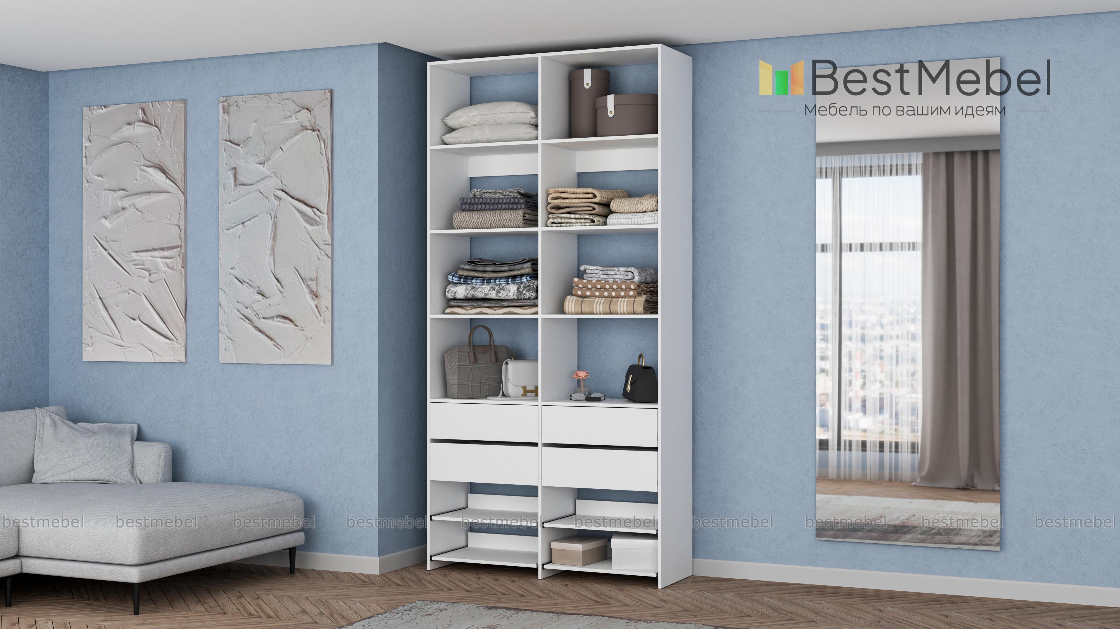 Стеллаж для одежды Мирта 85 BMS компактен и подходит для небольших помещений: прихожих, спален и гардеробных. Верхнюю часть конструкции занимают вместительные открытые секции, а нижнюю — четыре выдвижных ящика для белья и мелочей и удобные полки на направляющих. Продуманная компоновка позволит вам хранить как одежду и аксессуары, так и обувь. Купить стеллаж для одежды Мирта 85 BMS с самостоятельным подбором цвета и размеров вы сможете в нашем интернет-магазине.