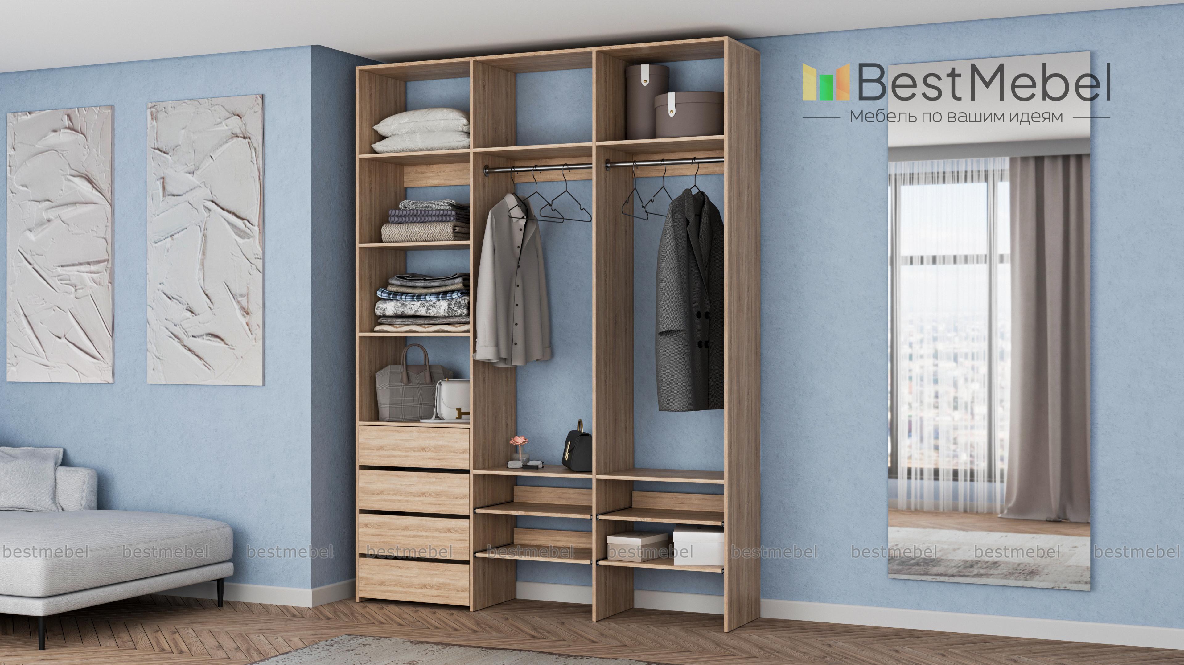 Стеллаж для одежды Мирта 99 BMS помогает сохранить порядок в вашей прихожей или гардеробной. Открытая конструкция укомплектована двумя одежными штангами, бельевыми и выдвижными полками, а также четырьмя ящиками для мелочей. Материал изготовления — ламинированная плита древесного оттенка, которая выдерживает большие нагрузки. Купить стеллаж для одежды Мирта 99 BMS в необходимом вам размере и цвете вы сможете купить на сайте нашего интернет-магазина.