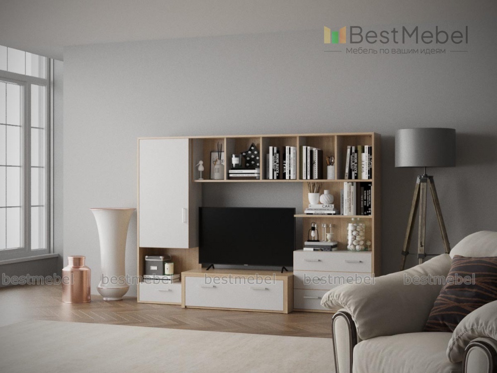 Гостиная Тиса-103 BMS понравится поклонникам простых и функциональных решений. Лаконичная конструкция будет прекрасным дополнением помещений в стиле минимализм. Гостиная оборудована тумбой под ТВ, комодом с выдвижными ящиками, пеналом и оригинальной композицией из открытых полок. Вы сможете компактно и эффектно разместить технику, интерьерные украшения, книги и множество мелочей. Купить гостиную Тиса-103 BMS, подобрав оптимальные параметры, вы сможете недорого в нашем интернет-магазине.