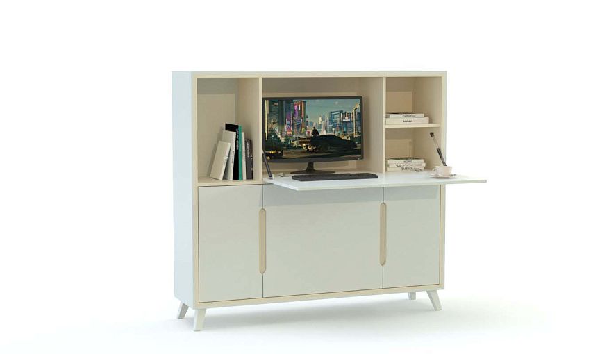 Компьютерный стол-трансформер Давид 2 BMS сочетает в себе функциональность и яркий дизайн, который превращает модель в стильный интерьерный акцент. В закрытом виде модель представляет собой широкую тумбу на высоких скошенных ножках, выполненную в нейтральных светлых тонах. Для удобного хранения рабочих материалов конструкцией предусмотрены ниша и глухие распашные отделения, а за откидной столешницей скрыта выделенная голубым секция под монитор. Купить компьютерный стол-трансформер Давид 2 BMS и сэкономить пространство вам поможет наш интернет-магазин.
