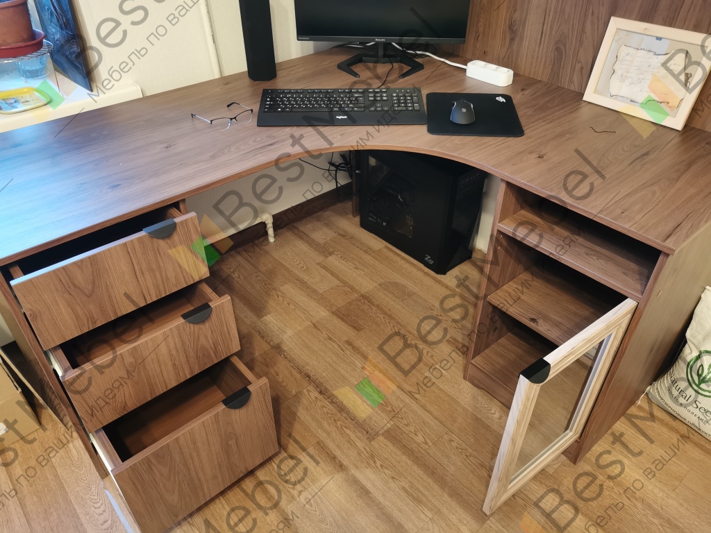 Приобрела стол данной модели в конце ноября 2025 года (заказ № 00000321456).Заказ делала в одном из офисов BestMebel, так как боялась ошибиться или просчитаться с размерами и конфигурацией сама через сайт - мне не была нужна приставная тумба, но нужны были ящики и тумба под единой цельной столешницей по моим размерам, плюс мне было важно живьем увидеть цвета и материалы. Эскиз мне составили быстро и четко по моим пожеланиям, менеджер была грамотна и терпелива (конечно же у меня были муки выбора цвета, ручек, фурнитуры, как без этого!).Отдельный респект за то, что перед запуском в производство вам направляют по почте на согласование технический чертёж с размерами, который получился по итогам составленного при заказе эскиза, и на этом этапе можно что-то поправить. В этом плане опасения насчет дальнейших самостоятельных заказов через сайт отпали.Производство и доставка были осуществлены без задержек, в обозначенные изначально сроки. Доставка порадовала аккуратностью, все было цело-невредимо, а еще человеческим согласованием времени доставки, что для работающего человека вот реально важно.Сборкой занималась сама, и для этого к доставленному товару прилагается очень удобная схема (не та, что распечатанная, а та, что по qr-коду на распечатке). Все доставленные вам детали пронумерованы, и каждую из деталей вы можете по номеру найти на интерактивной схеме и увидеть, как и где она должна быть расположена. Короче рукодельники получат от сборки отдельное удовольствие! Все необходимые отверстия уже просверлены, все необходимые крепежи в нужном количестве (и даже с небольшим запасом) приложены. Собранный стол полностью соответствует моим ожиданиям, качество материалов порадовало (первые пару дней был запах дерева в комнате, но никаких химических запахов), при сборке проблем (типа кривого распила) не возникло. Рекомендую!