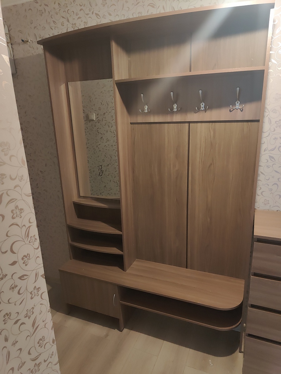 Хорошая прихожая за свою небольшую цену. Но есть нюанс: при максимальной ширине прихожей в 1,4 м горизонтальная ДСП, на которую предполагается садиться завязывать шнурки, заметно прогибается под весом садящегося. Теоретически может и треснуть. Явно по её середине требуется промежуточная вертикальная подпорка (из 2-х частей: от пола до нижней полки, и от полки до сиденья). Сделать самому такую подпорку, закрепив на уголки, не вижу проблемы, благо мебельные щиты стандартных цветов продаются. Для стандартного же варианта ширины (90 см) такая доработка, скорее всего, не потребуется.