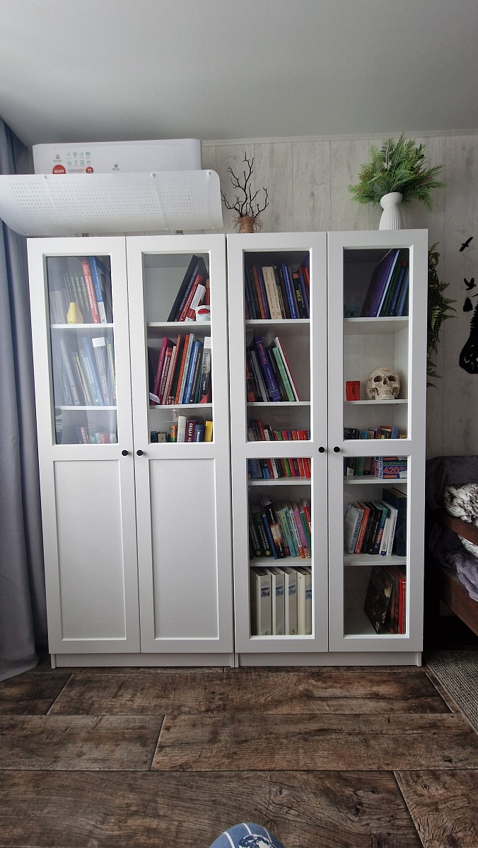 Шкаф в выбранном цвете смотрится шикарно. Из-за того, что книги очень высокие, пришлось менять высоту полок (что-то заранее сделали, что-то на месте). Понравилось, что можно менять конструкцию и даже что-то вне указанного (та же высота полок).
