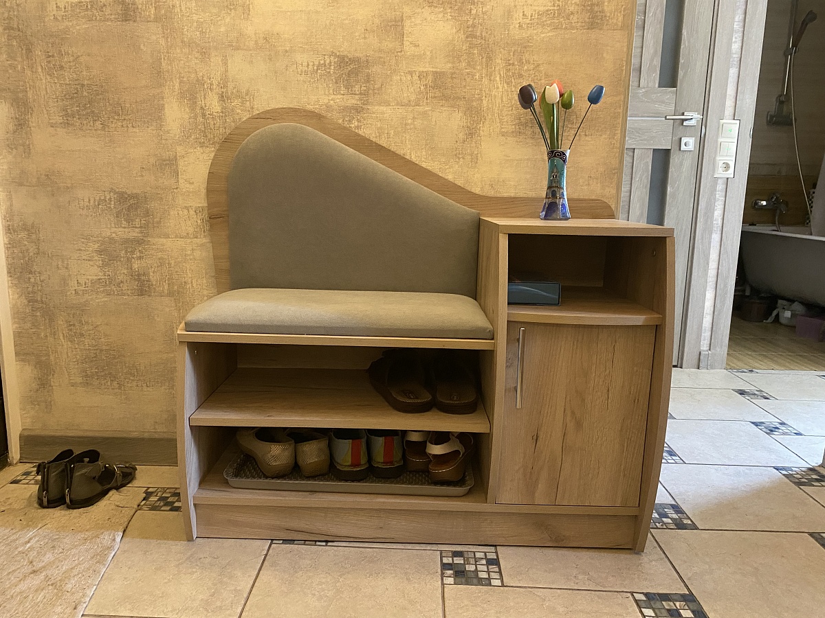 Очень красивая и удобная тумба для обуви. Выбрали цвет корпуса и обивки, а также размер, подходящие под нашу прихожую.  Все изготовили в срок, аккуратно доставили и собрали.