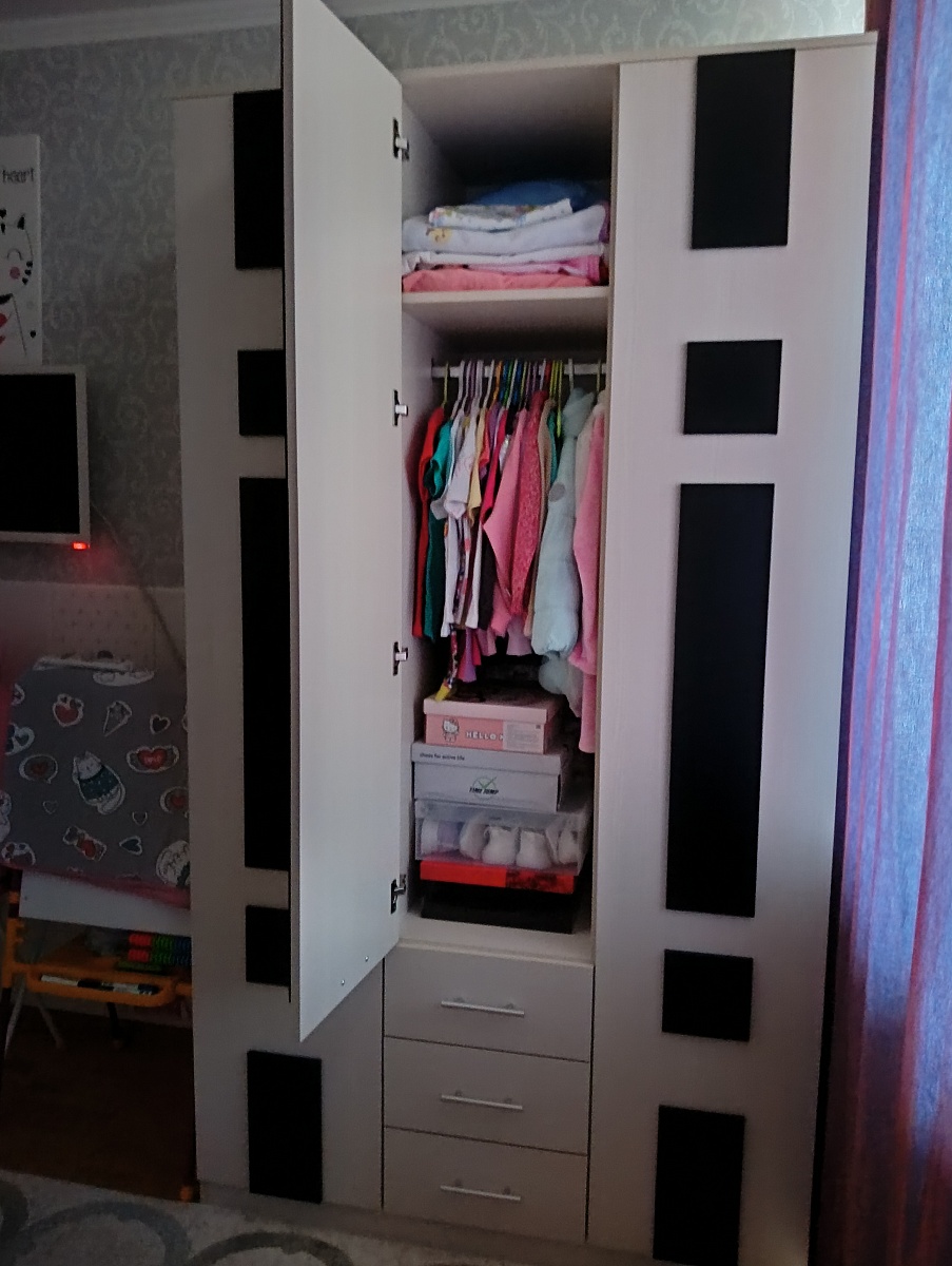 Заказ 00000724769,Распашной шкаф Комфорт BMS вместительный,разложила все вещи.Очень удобно,что можно выбрать цвет на свой вкус,фурнитуру и внутреннее наполнение изделия.Эскиз итоговый согласовали перед производством,заказ доставили быстро.