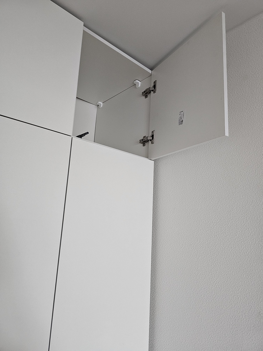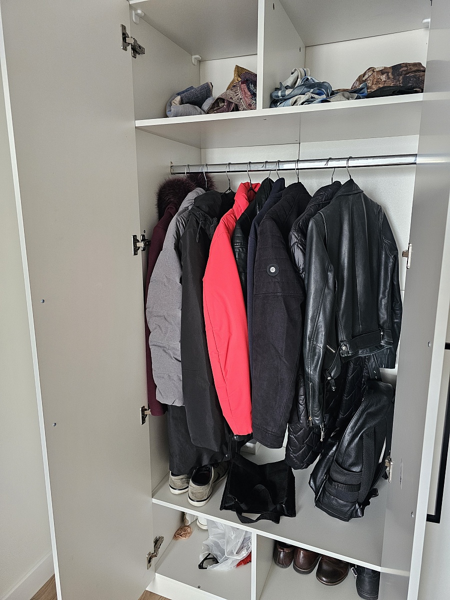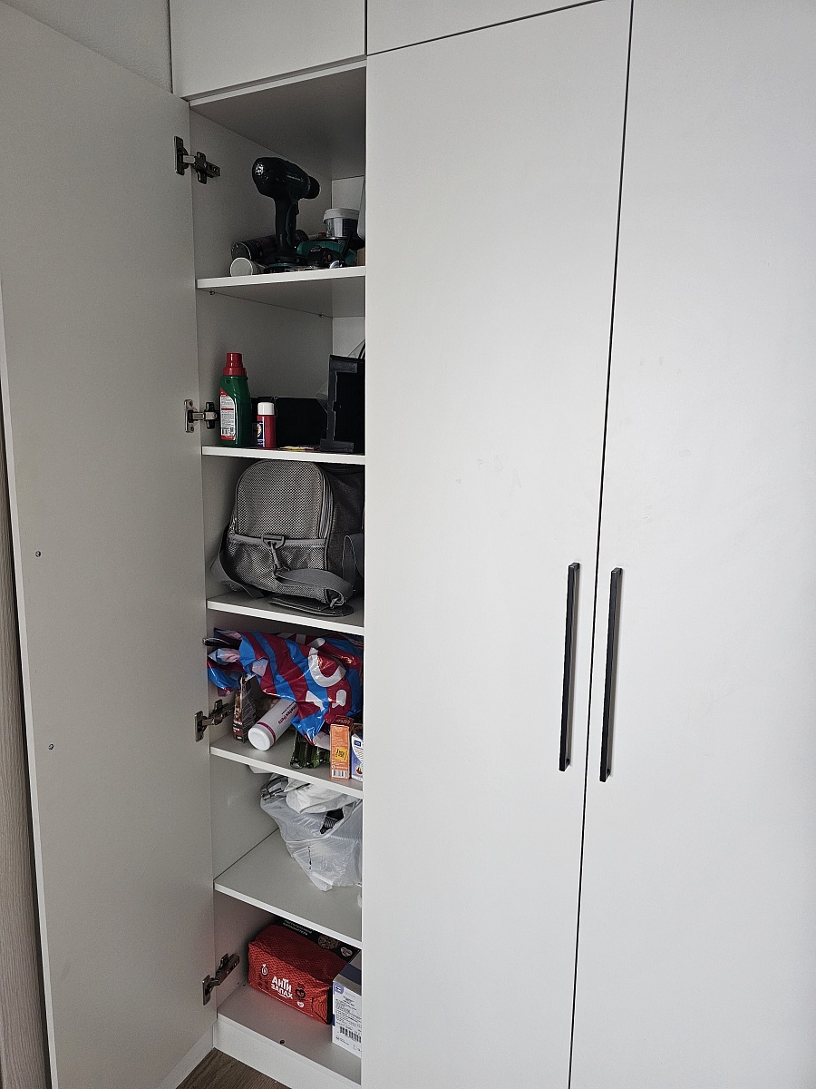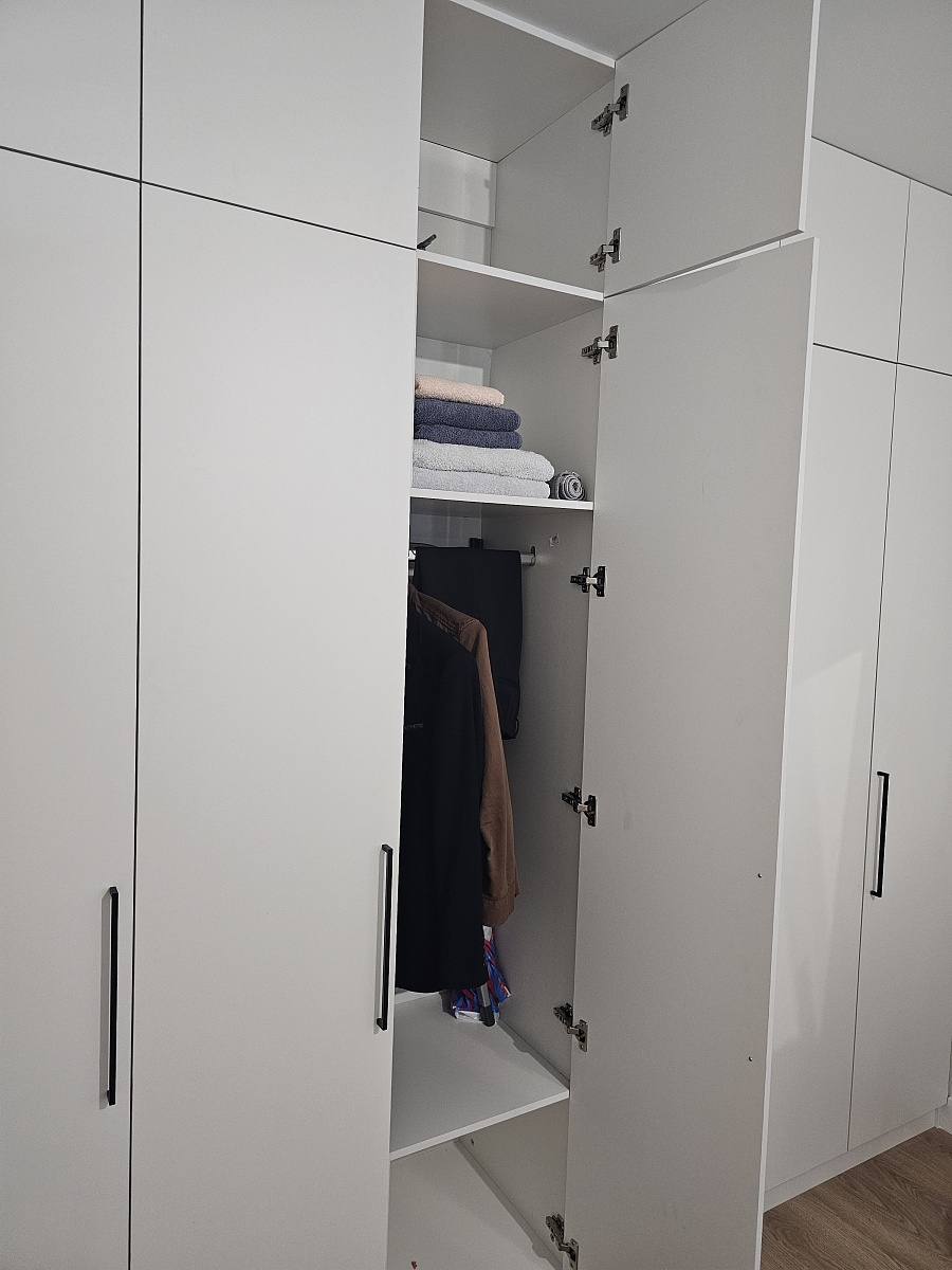Единственный шкаф, который смог идеально подогнать в нишу спальни от и до стены. Продуманные полки, качественная фурнитура. Очень понравились черные ручки, как тактильно, так и по дизайну.