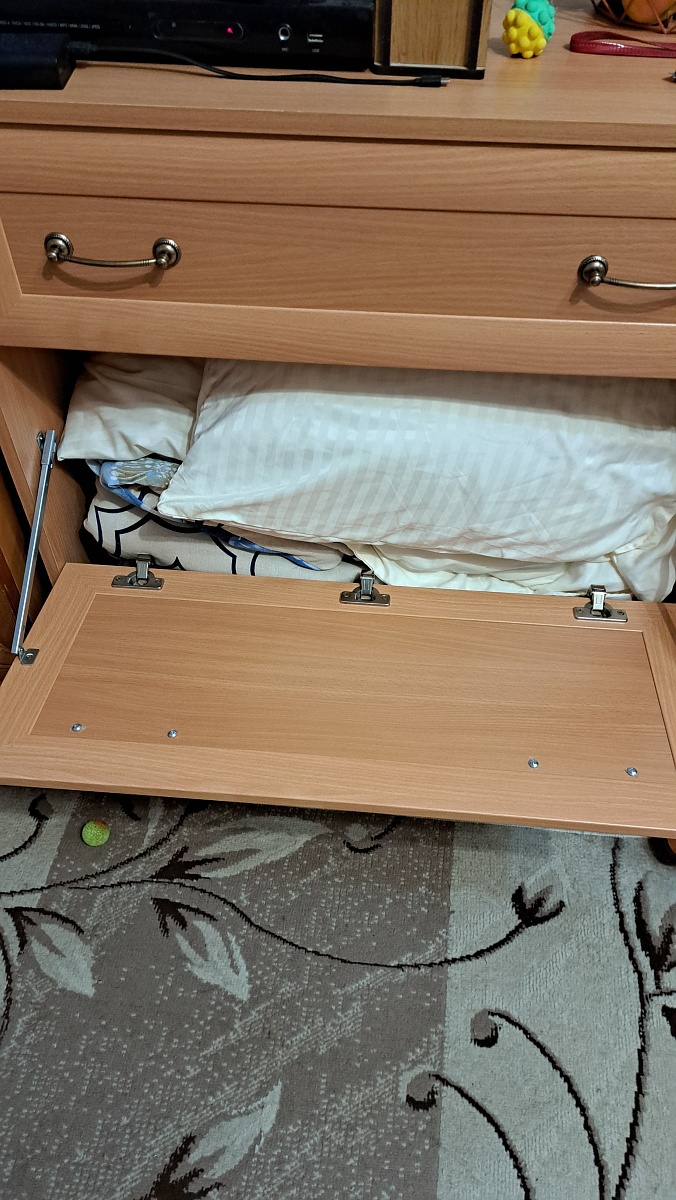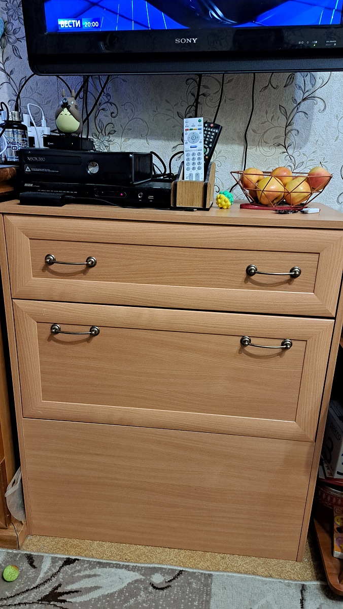 Отличный комод: вместительеый, удобный, красивого дизайна. Сборка немного напрягла: муж немного запутался в досках (инструкция непонятная, надо последовательные шаги указать, а не картинку в разрезе. Но самое загадочное - отсутствие дыр для ручек на откидной крышке. Пришлось высверливать для болтов. Затратно по времени вышло.