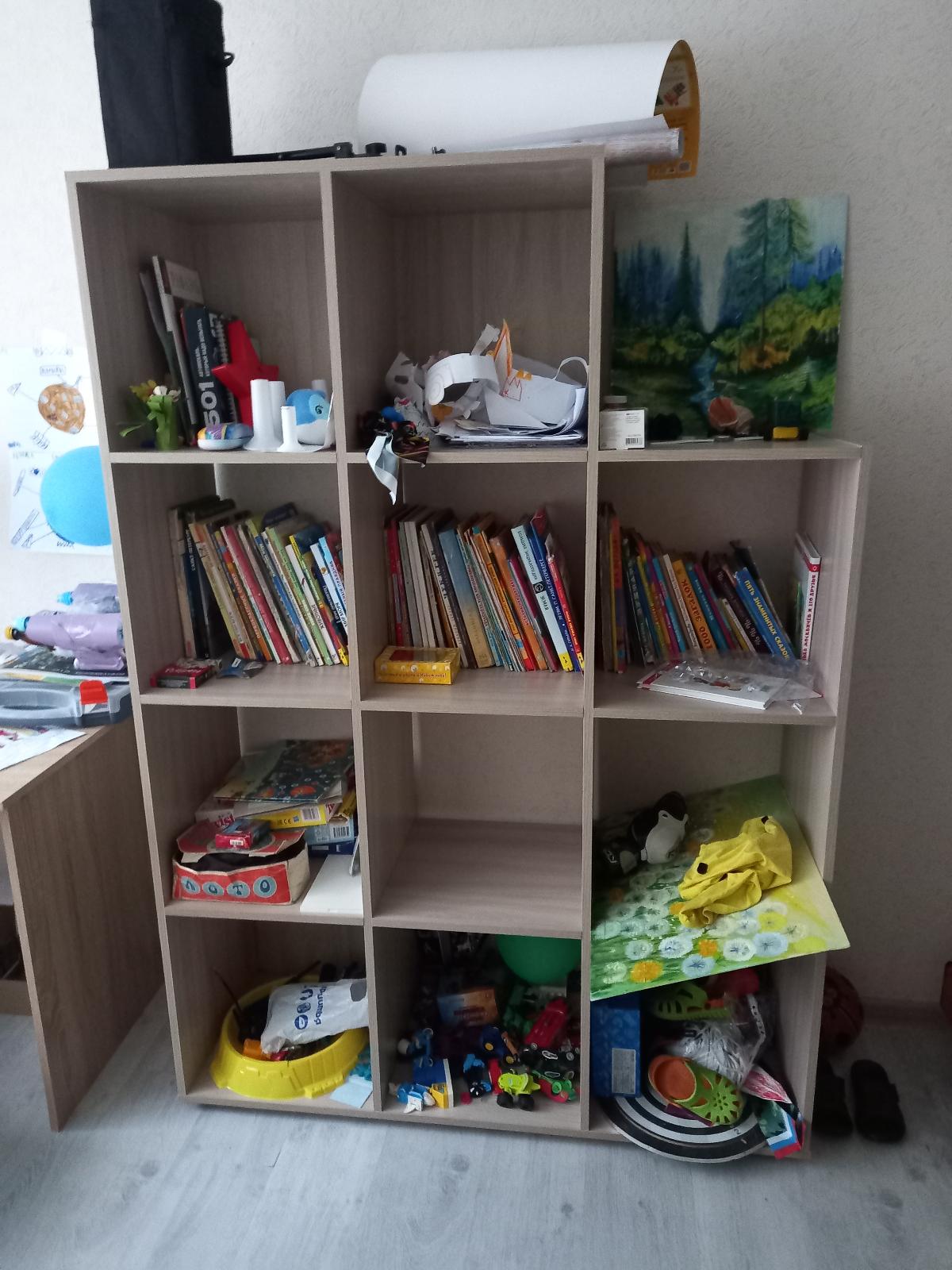 Я искала стеллаж вместительный, стильный, под цвет остальной мебели (ясень шимо светлый+ясень шимо темный) и чтобы ячейки совпадали с 'известным скандинавским брендом'. Остановила выбор на этом интернет магазине из-за значительно низкой цены и потому что не надо было ждать изготовления. Собирали сами, ничего сложного. В комплекте ещё идут дверцы, но мы пока не ставили. Так же их можно будет приспособить как дополнительные полочки при необходимости