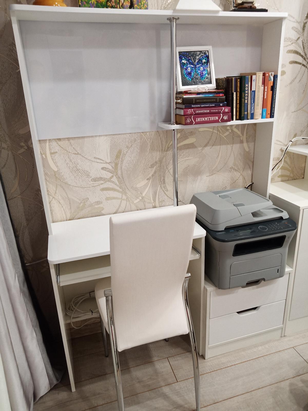 Заказ № 00000516487.Недавно сделал ремонт в комнате, решил купить компьютерный стол, которого не было. Долго выбирал альтернативу, но все не подходило, пока я не увидел стол МБ 46.1 BMS в интернет-магазине мебели «Bestmebelshop». Он меня устроил и по внешнему виду, и по размерам, и конструкции, а теперь делюсь впечатлениями и нюансами. Компьютерный стол МБ 46.1 BMS является хорошим вариантом для комнаты благодаря компактным размерам и яркому современному дизайну. Модель оборудована удобной для письма и работы за компьютером столешницей, выдвижной полкой для клавиатуры, тумбой с двумя ящиками, совмещенной с боковиной, и надстройкой на хромированной опоре. Есть возможность изменить размеры, цвет и другие параметры изделия.Почему выбрал. Во-первых, мне понравился внешний вид — смотрится стильно и классно. Во-вторых, выбрал нужную мне расцветку (белый глянец - фасад, остальные детали белые гладкие), другие варианты не подошли бы, поскольку вся мебель в комнате имеет именно такое исполнение. А так цветов много: венге, дуб молочный и др., так что мебель для компьютера можно подобрать практически для любого интерьера.В-третьих, мне нужен был длинный стол, изготовленный по индивидуальному заказу. Это решение позволило разместиться на моем столе все, что мне нужно было и вписаться столу  в размер комнаты рядом с комодом.Сборка. Без опыта работы я сам собирать не решился, а доверил это дело специалисту, который собрал быстро и качественно.Обращаю ваше внимание на отсутствие отверстия для кабелей и розетки для стола которую можно было выбрать а параметрах стола дополнительно. Розетку для стола не заказал потому что это невозможно было сделать чисто технически из-за того что стол был заказан узкий (всего 40 см). Этот момент обсуждался со специалистами  в процессе оформления заказа. Отверстие для кабелей сделал сам, так как не предусмотрел в заказе. Кроме того стол доработал сам, купил в Леруа Мерлен лист белого пластика, отпилил по размеру и сделал заднюю стенку в верхней части стола. Получилось то что надо, посмотрите на фото. Покупкой очень доволен. Благодарю за прочтение отзыва!