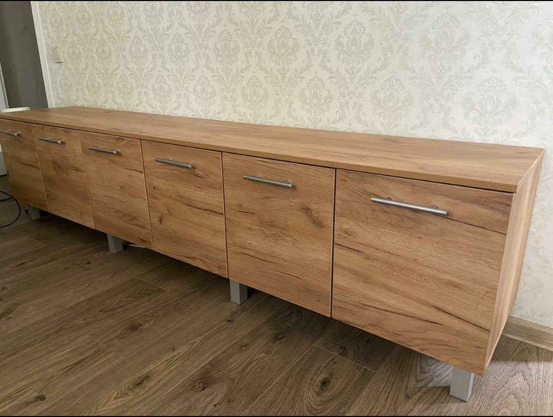 Отличная тумба, приятный современный вид, цвет выбрали золотой крафт, смотрится прекрасно, отдельно докупались ножки хром в цвет ручек, чтобы влажную уборку делать, но можно было и подвесить. На тумбу кладу ноутбук, сумки гостей, фрукты/десерты, много чего, внутрь вмещается много контейнеров с всякой всячиной: книги, нитки, лекарства и пр. Я на неё сажусь иногда, выдерживает (по этой причине не хотели подвешивать). Размер тумбы на фото: 220 × 44× 40 см. Рекомендую!