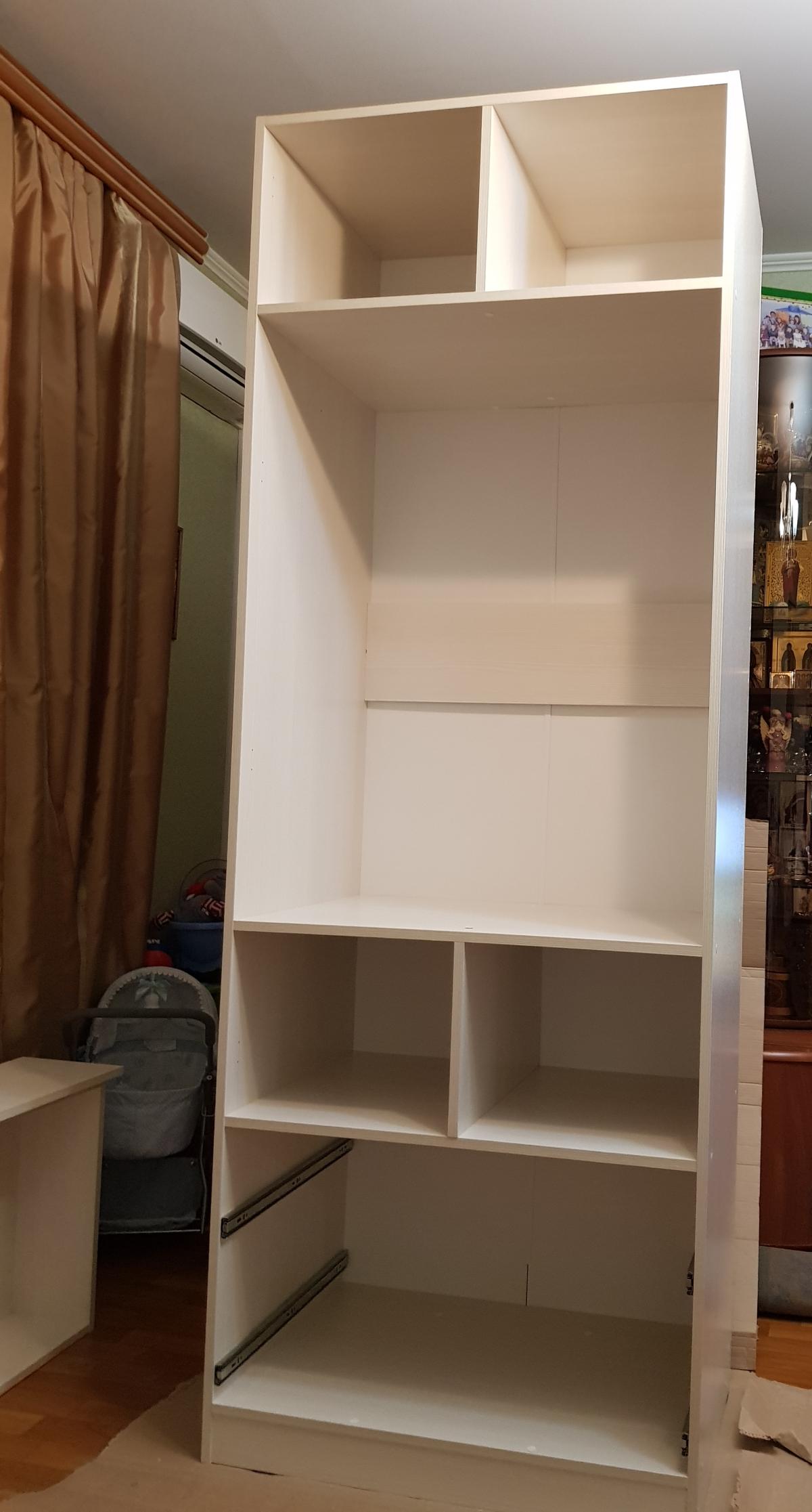 Очень довольна покупкой. Можно выбрать любой цвет и компоновку шкафа. Шкаф компактный и вместительный. Качество хорошее. Без царапин и сколов. Не сложная сборка. В белом цвете с 5 полками цена около 8 000 руб., что значительно ниже чем в других магазинах. Быстрая доставка, после оформления заказа доставили через неделю