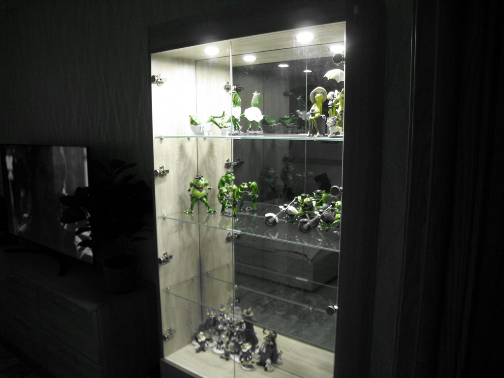 Заказ 00000989846, торговый стеллаж Кассиопея 2 BMS.Жене домой нужен был удобный вместительный стеллаж (витрина) со стеклами и зеркалом для собирающейся коллекции лягух и клованов.Выбрал этот, в моих размерах 2000х900х280, без замков.В итоге собственной сборки получилось то, что надо. Но, увы, не без танцев с бубном.Стеллаж очень тяжелый (зеркало + задняя стенка мебельный щит).Стекла, особенно тонкие дверцы с отверстиями под петли, приехали целыми. А на них даже дышать страшно...Стеклянные дверцы устанавливаются, как вкладные, снизу получается щель где-то 2 см, если не часто, то открывать удобно, и стекла не пачкаются.Подрезано всё отлично, никаких проблем.Освещения, идущего в комплекте, вполне достаточно.Минусы:На некоторых панелях кромка может выступать за геометрию на 1 - 1, 5 мм, приходится подрезать.Петель на нижние дверцы в наборе не оказалось, только 4 ответки. Поставил свои.Для петель на стеклянные дверцы стекло 3мм слишком тонкое, пришлось купить резиновые кольца (из автонабора колец, по 3р.), и взять более длинные саморезы для затяжки петли на стекле.Докупил А-образный силиконовый профиль (можно разрезанную трубку)  на торцы полок, иначе дверцы просто побьются.Зеркало испачкано чем-то белесым, что даже растворителем не оттирается до конца.В комплекте черный провод 220v... И что им делать? Ни одной выборки под провод, чтобы как-то незаметно опустить его хотя бы в нижнее отделение стеллажа, в конструкции не предусмотрено. Подсверлил, поставил тонкий прозрачный, врезал удобный микровыключатель.В целом всё устроило, но повозиться пришлось изрядно.