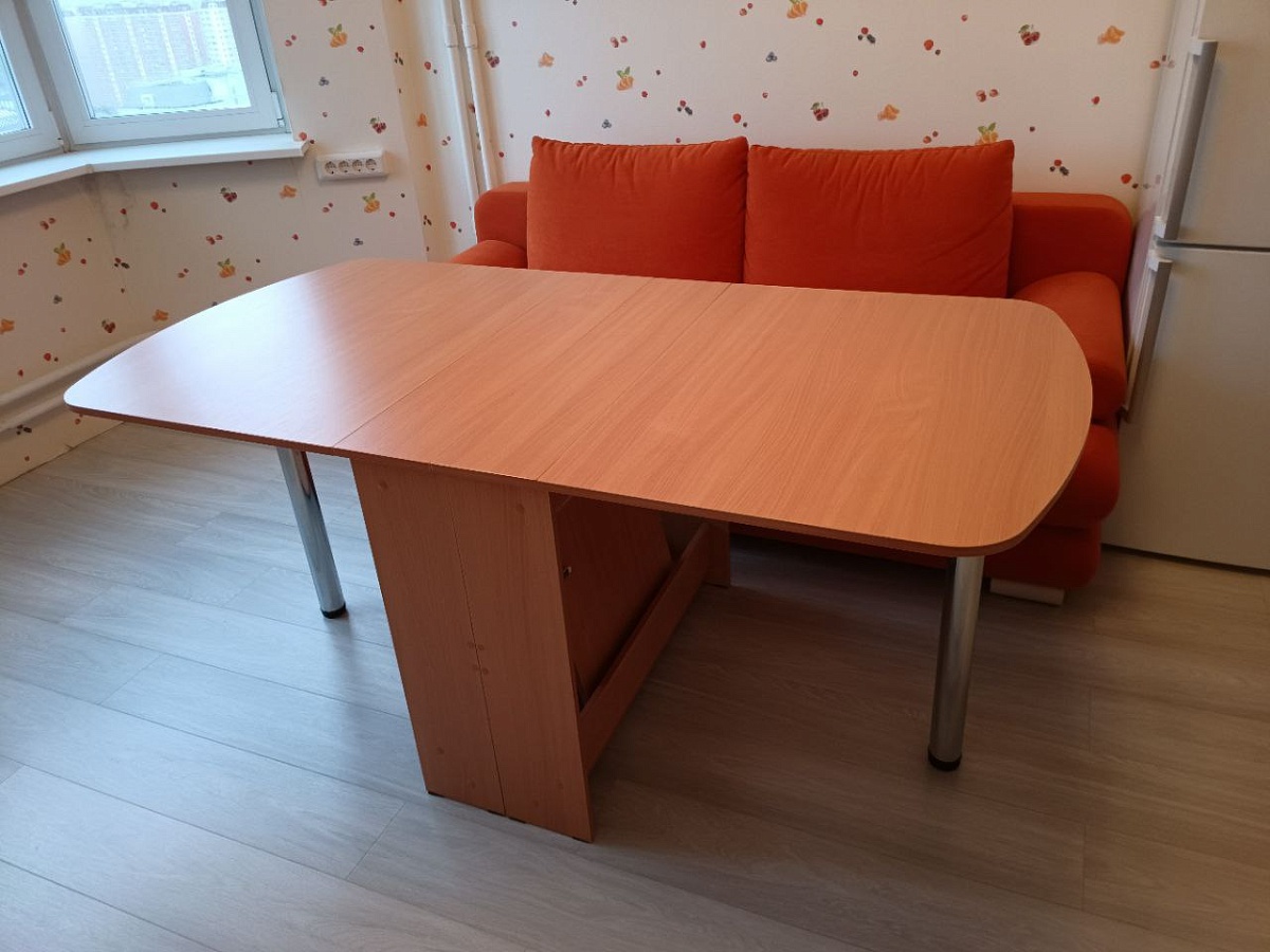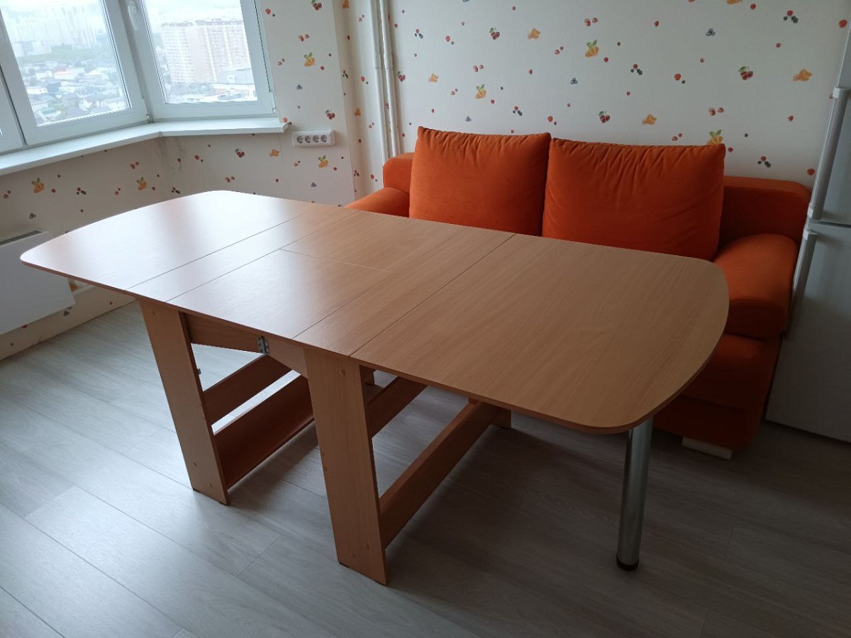 + В разных конфигурациях - разный размер. Удобно менять по ситуации.+ В полностью разложенном виде комфортно умещаются 10 человек.+ При заказе указал глубину 900. Сделали, все детали прекрасно вписались.- Самая большая проблема - вставки столешницы. Их предлагают соединить хлипкими скрытыми петельками. Снизу их ничего не поддерживает. Эти петли у меня сломались. Лучше заменить их на шканты.- Заказал кромку 2мм на лицевых панелях. В магазине перестарались и сделали её даже на стыках деталей столешницы. На этих стыках надо оставлять минимальную кромку.- Разметка для мебельных винтов - верная. А вот разметки для карточных петель и фиксаторов - все были неправильные. Вплоть до того, что фиксатор вставок столешницы предлагали закрепить на пути открытия царги. Пришлось самому размечать и пересверливать места крепления петель.